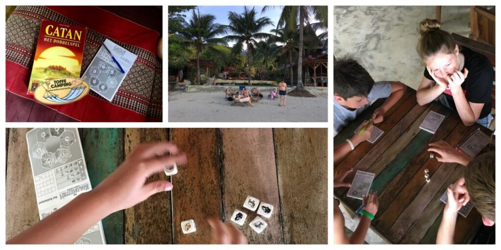 Catan dobbel reisspel. Getest Op Kho-Phanang / Thailand door Jools,Django,Luca,joshua en Ryan.Als we het over het gewicht en afmeting hebben , yep het is een reisspel beste mensen , een dikke tien. Hebben we het over “is het een vet spel ” , yesssss. Super leuk spel.zegt Jools. Luca zegt “leip” . Django en Joshua : “vet cool man ” Ryan : ‘ Leipe shit man ” Met andere woorden . Leuk ,lekker spelletje wat ongeveer 20 minuten duurt . Niet moeilijk om te leren .En ook tof er zijn twee varianten op het bloknote aanwezig.
