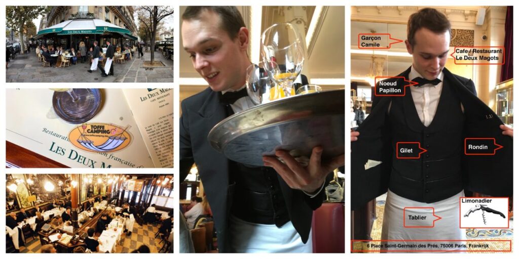 Vanuit Bangkok hadden we een tussenstop in Parijs en door ellende elders in de wereld zatten we tijdelijk vast in de lichtstad . Buig misère om naar plezier is een tof moto . Dus we zaten met het ehle zootje op zondagochtend om 10 uur in de trein vanuit Charles de Gaulle airport richting Boulevard St. Germain waar een heel kluitje toffe cafes en restaurants zitten. Le deux Magots , cafe Flore en schuin aan de overkant Brasserie Lipp. Het word “Le Deux Magots” . In Parijs, is ober nog echt een beroep .Kijk naar die vingers onder het dienblad , zo elegant en sterk. Camile de ober was zo vriendelijk om ons uit leggen wat de namen zijn van zijn werkkleding. Helaas was Hemingway net vertrokken maar dit is een prima plek om “De wereld rond langs 80 kroegen”te starten.