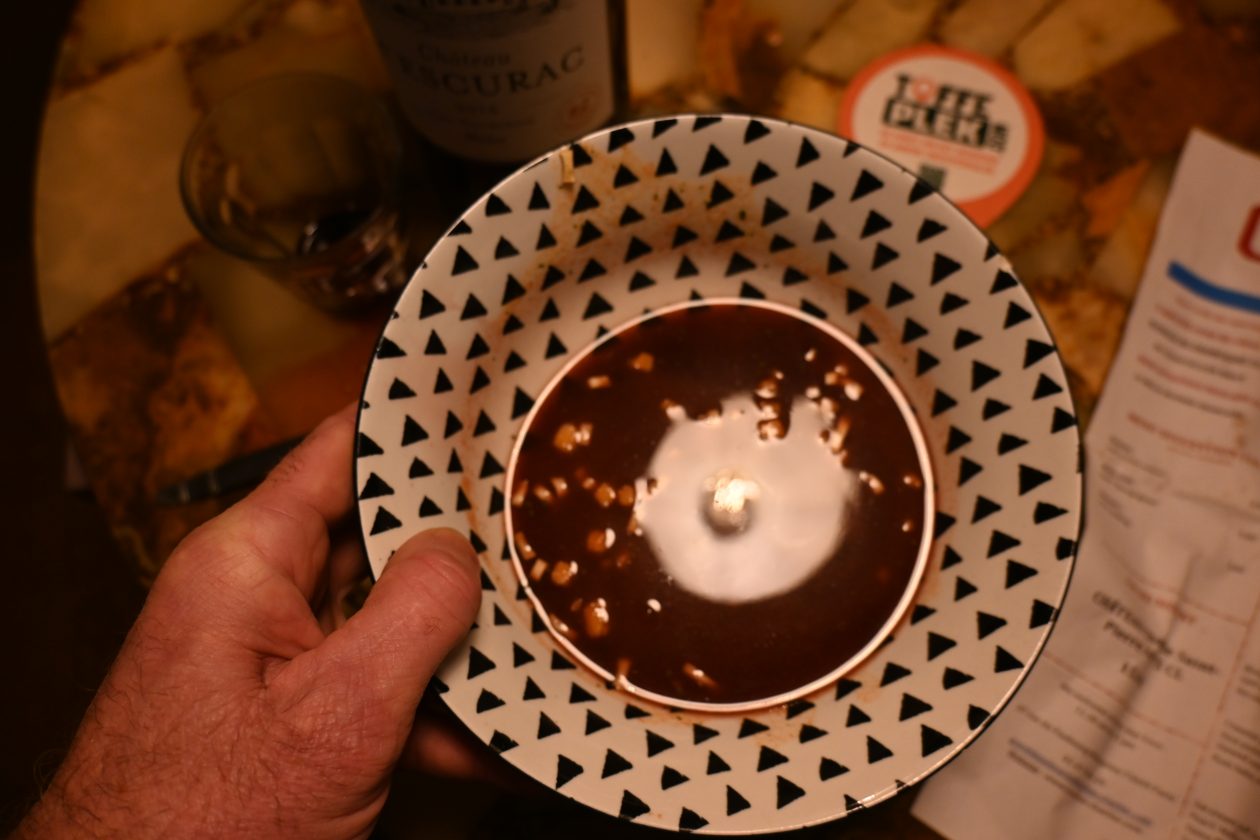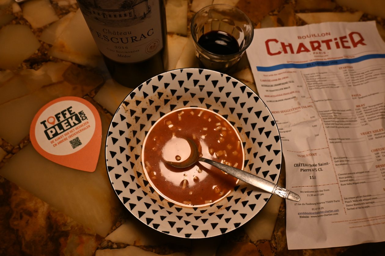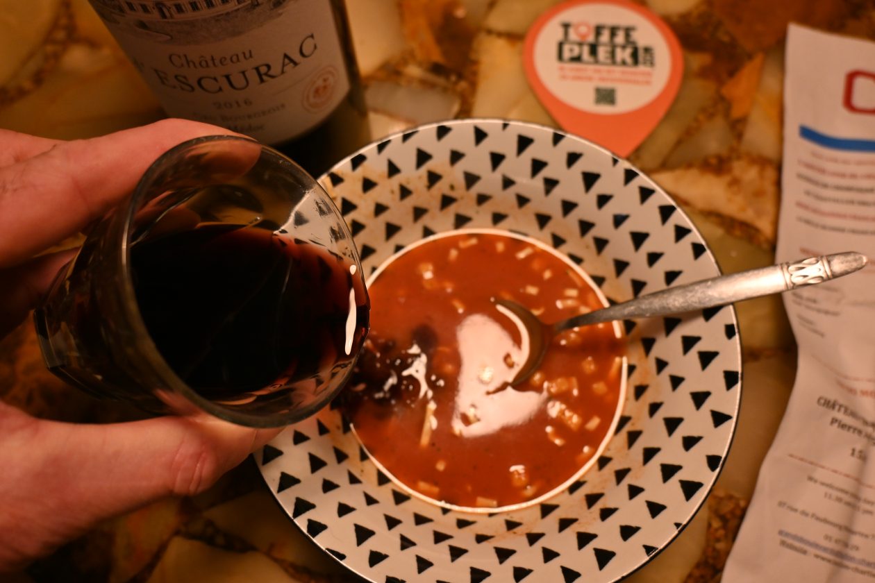 Jaren terug heb ik eens een seizoen gewerkt op een camping in de Dordogne .Naast Nederlanders werkten er ook wat Fransen. Aan het einde van de dag werd er gegeten aan lange tafels waar om de halve meter een karaf wijn stond. Lege karaffen werden bijgevuld uit een 225 liter vat , en het was dan ook elke avond feest. Met rode tanden opstaan ,dat werk . Een van de eetgewoontes van de Fransen nam ik pijlsnel over , en dat was Chabrol. Als je soep bijna op is dan leng je hem aan met een flinke scheut rode wijn . fantastisch lekker . Bijgevoegd een tof recept voor vanavond, kan je meteen de Fransman uithangen.