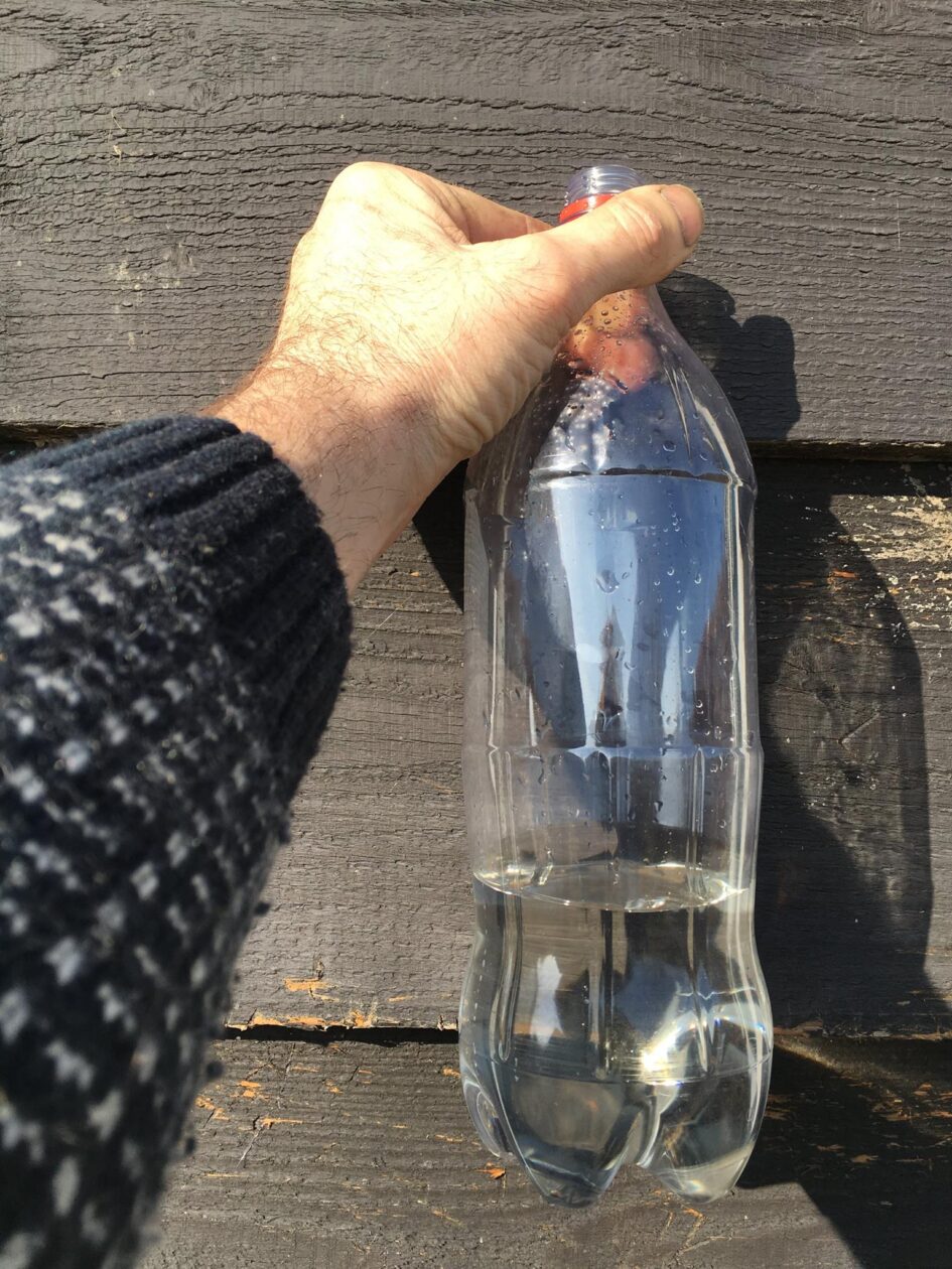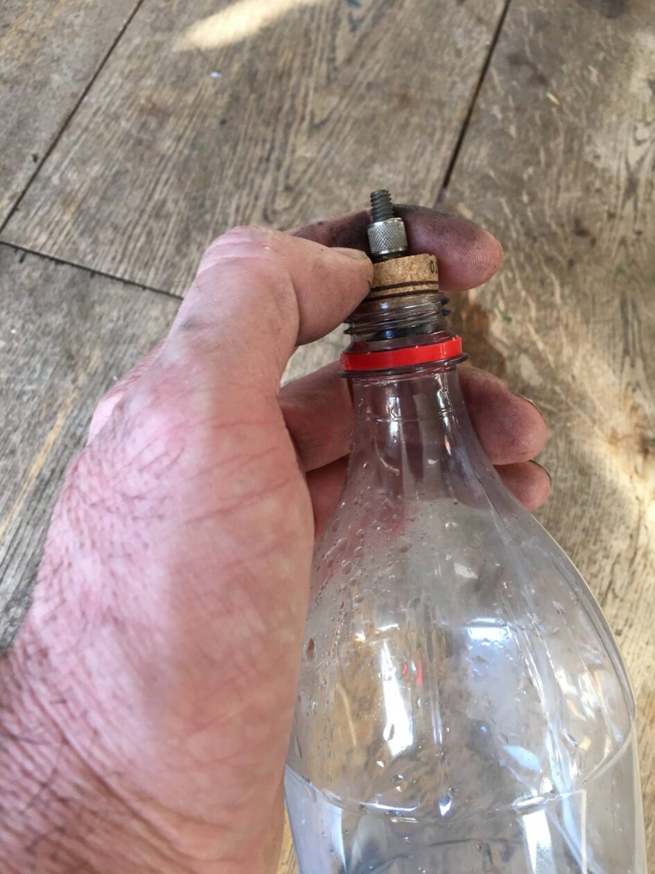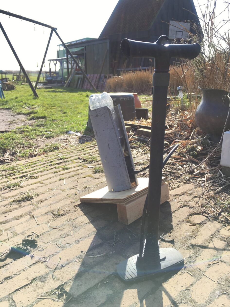 Zet de fles met het ventiel naar onder gericht schuin tegen een steen of zelfgemaakte lanceerinrichting en pomp nu met een fietspomp lucht in de fles.