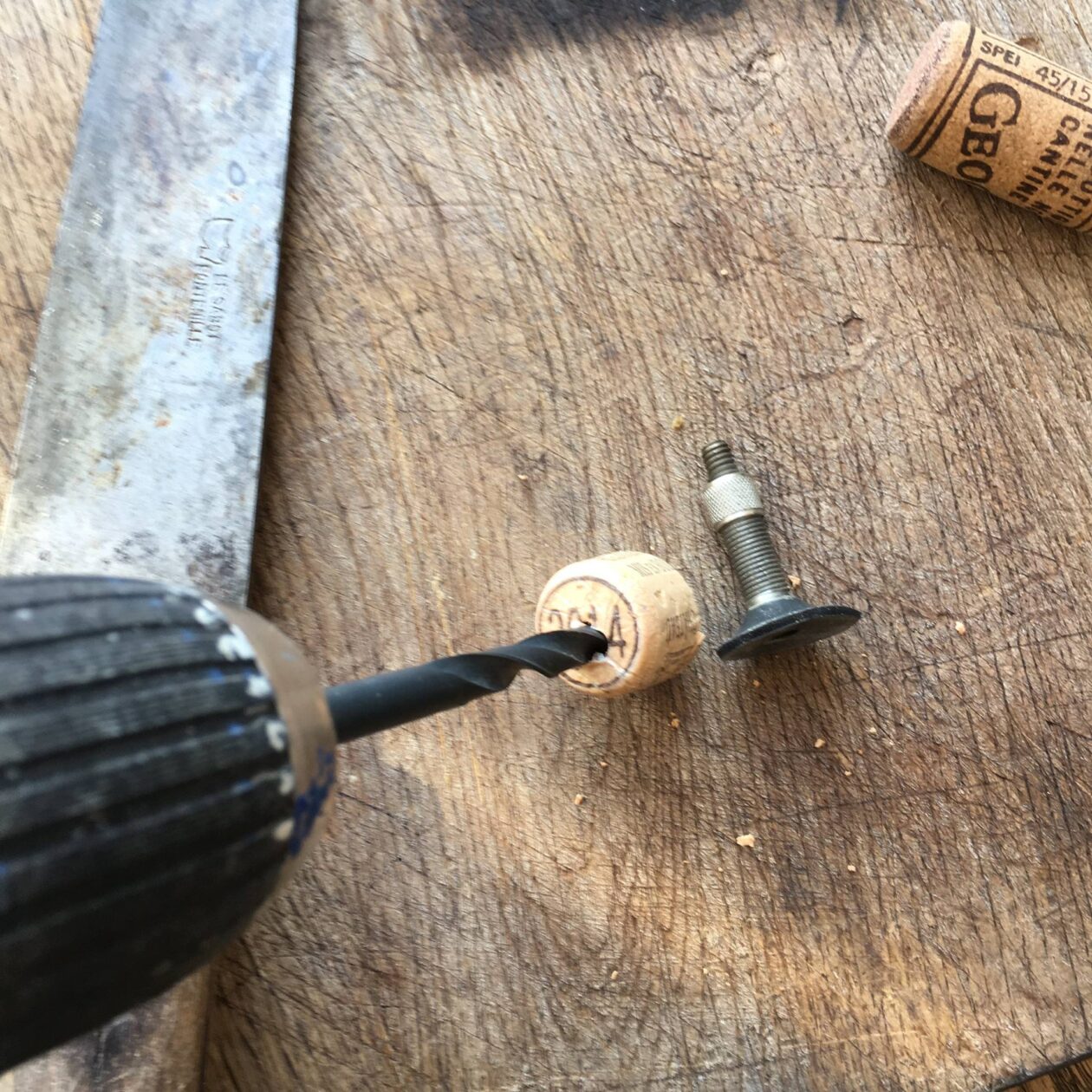 - gaatje boren in de kurk en het ventiel erdoor heen draaien