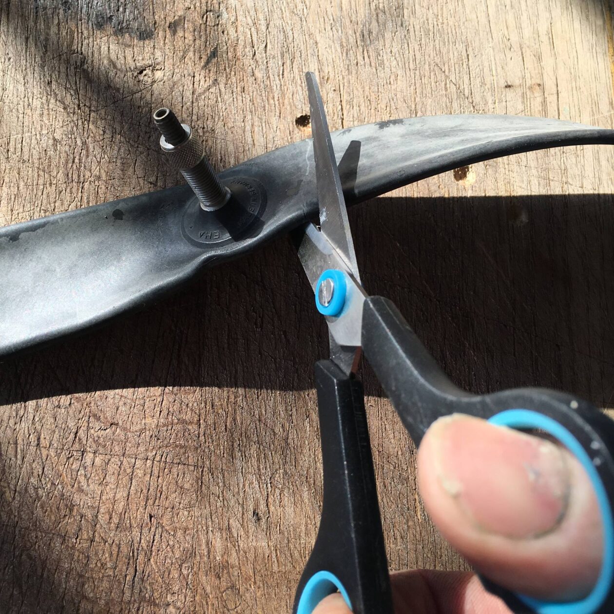 Knip uit een oude fietsband het ventiel – hou een kleine cirkel rubber van de band om het ventiel (zie foto’s)
