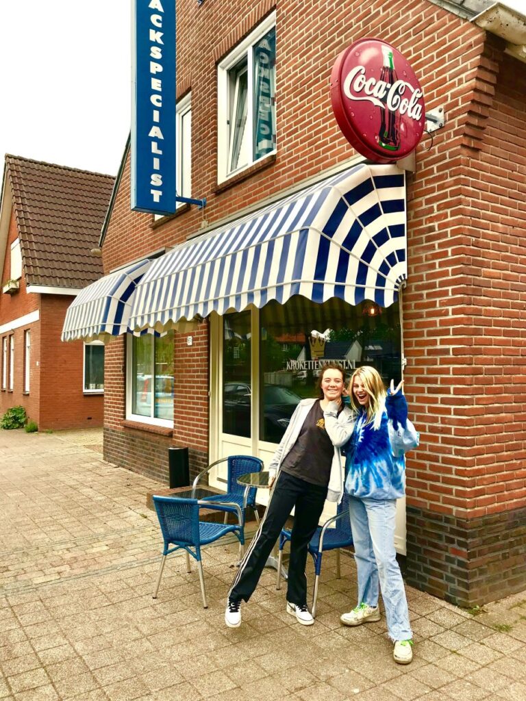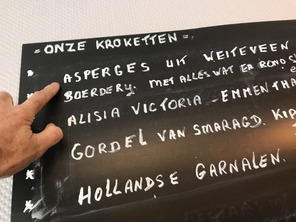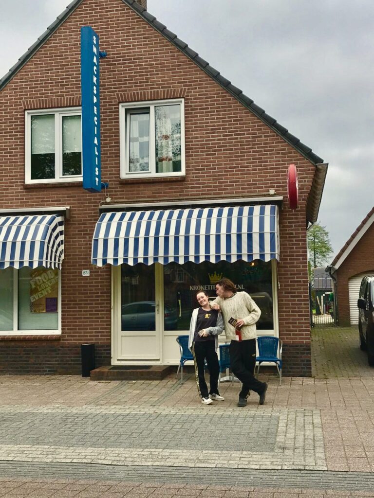 Goed , met een flinke dosis tegenzin hebben we ons losgerukt uit de warme boezem van Camping de Lievelinge . Op zoek naar troost maken we een kleine omweg via Nieuw Weerdinge om daar bij Krokettenkunst Prinsen te lunchen . De hoop was gevestigd op de aspergekroket . Met de handgemaakte seizoenskroket regelrecht uit de hemel neergedaald . Gemaakt en bedacht in Nieuw Weerdingen . Hij stond op het bord gekrijt . Geluk was ons deel .Het is ook de enigste snackbar die ik ken waar je champagne en uitstekend. Witte wijn en rosé kan kopen . Proost !