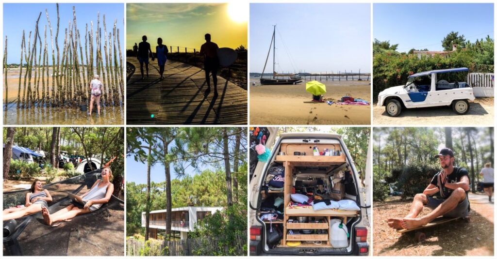 Frankrijk / Cap Ferret / Camping Le Truc Vert . Op de hoogte van Bordeaux en aan het bassin van Arcachon ligt camping Le Truc Vert . 200 plekken en op een daarvan staat onze blauwe vakantiebus geparkeerd in de schaduw van enorme zeedennen waar altijd een zilte bries doorheen speelt en op 10 minuten lopen van de golf van biskaje .de camping word bevolkt door surfers / skaters / tattoo gasten , jong en oud gitaarmuziek en Franse hiphop .kortom we zijn geland op een prima plek .Zes kilometer verder de punt in ligt Cap Ferret mooi te wezen . Cap Ferret een vat vol tegenstrijdigheid . Oestervissers vs het elegante Botox leger .kitesurfers vs jetski maffia . Festivalbandjes vs dure klok en campernomaden vs beachhouse . Het kan ,het mag en ik vind het tof . Ik ben nog steeds op zoek naar mijn luie ik en ik denk dat ik dat vandaag op een longboard ga doen “Le truc Vert style”