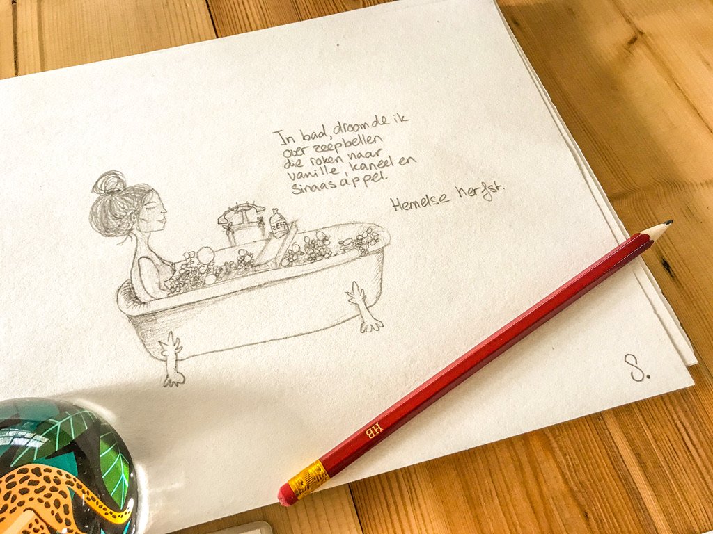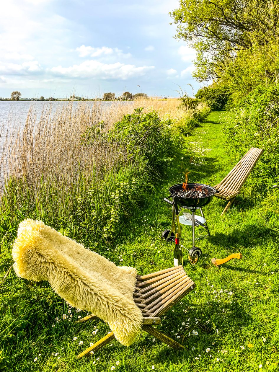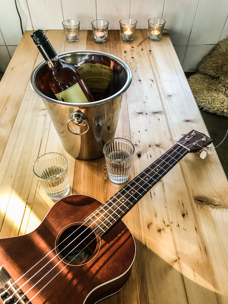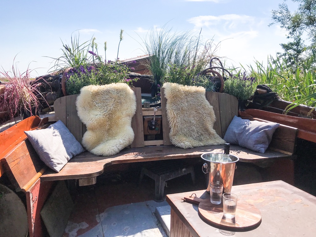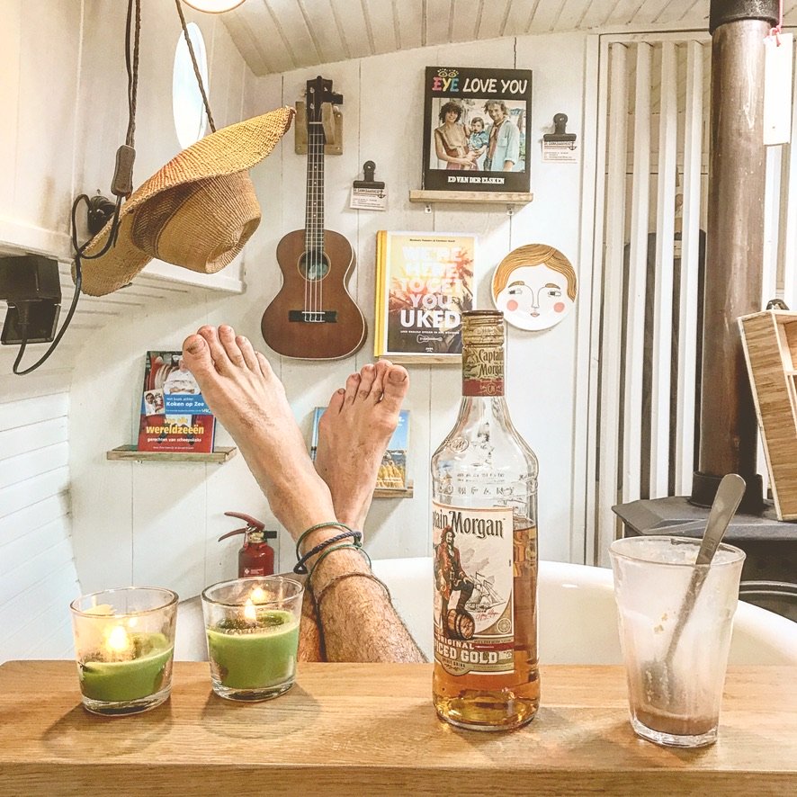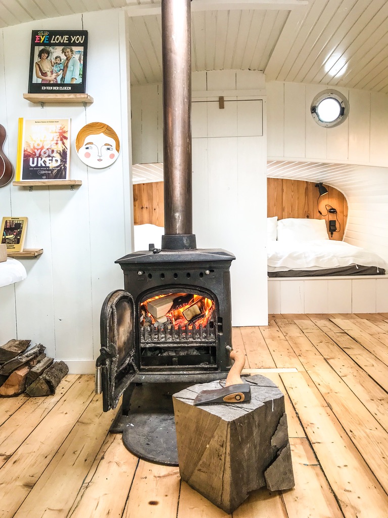 Binnen staat een ligbad onder het dakraam naast de houtkachel . Sterren kijken en mijmeren .