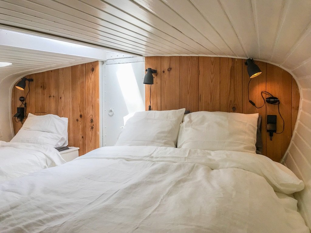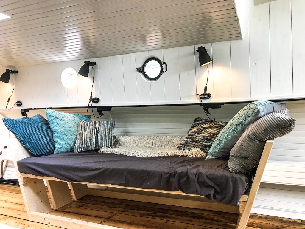 Er zijn vier slaapplaatsen aan boord  – een twee persoons bed met daarnaast een een persoons bed een een slaapbank in de huiskamer .