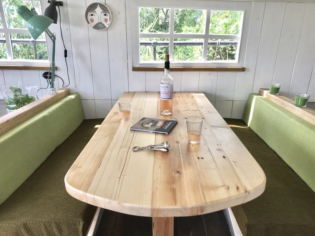 Binnen staat een ligbad onder het dakraam naast de houtkachel . Sterren kijken en mijmeren .