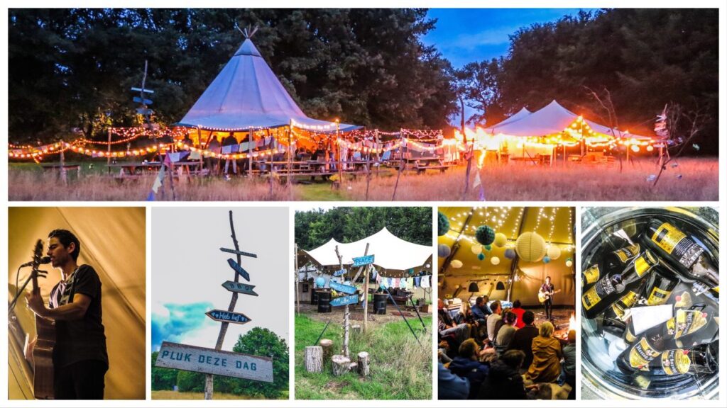 Donderdag aan het einde van de dag sjees ik over de afsluitdijk naar Drente met een uitnodiging op zak voor een mini concert van Mark Wilkinson in een tipi op het terrein van Puur!Beleven in Frederieksoord. Frederiksoord , nooit van gehoord .Maar als je door een tunnel van naar elkaar gebogen bomen waar het zonlicht zo lekker door heen speelt naar de boerderij van Puur!Beleven rijd dan vraag je je af waarom niet . Wat een plek ! De bewoners Ike en Suzanne staan me al met open armen op te wachten .Welkom ! Wijntje ? gastvrijheid op zijn Drents . Mooi man . Mark Wilkinson komt ook aan geslenterd met een fles pils en een gitaar op zijn rug . We proosten . Hij is een eind van huis . “Australia mate , good te be here ” mooi vet accent . In de stal van de boerderij staan ballonmanden en reusachtig ingepakte ballonen van Ike want de man is ballonvaarder . Met een brede grijns verteld hij hoe het is om door de wolken omhoog te schieten naar daar waar altijd de zon schijnt en je met een beetje mazzel in een oneindig landschap terecht komt van witte donzen bergen . “Ik ga met je mee , ik wil omhoog” . “Tuurlijk ” alleen niet vandaag . Mark begint . In een reusachtige Tipi achter de boerderij aan de rand van het bos zitten een man of 50 rond een kampvuur terwijl Mark de eerste akkoorden aanslaat . Man wat is dat toch lekker , de magie van muziek en dan ook nog pal voor je neus . Mooie breekbare liedjes zingt hij met af en toe een lekker up-tempo nummer . Wijn word bijgeschonken en er word geproost . Het leven is verukkullukkk . Als de zon is wegzakt doen de stringen met lampen hun werk en verlicht het kampvuur de tipi . Je word er stil van . Nadat Mark zijn laatste nummer heeft gespeeld pakt iemand anders de gitaar op en gaat het feest nog even door . In Drente word het nog aarden donker savonds en de grote beer steekt helder af . Om een uur of een rol ik van een hooibal af en sleept de favoriete neef me naar de boerderij van Ike en Susanne want morgenochtend gaat de wekker weer vroeg af . Susanne organiseert voor een ieder een feest naar wens in de periode van 1 mei tot 1 oktober.