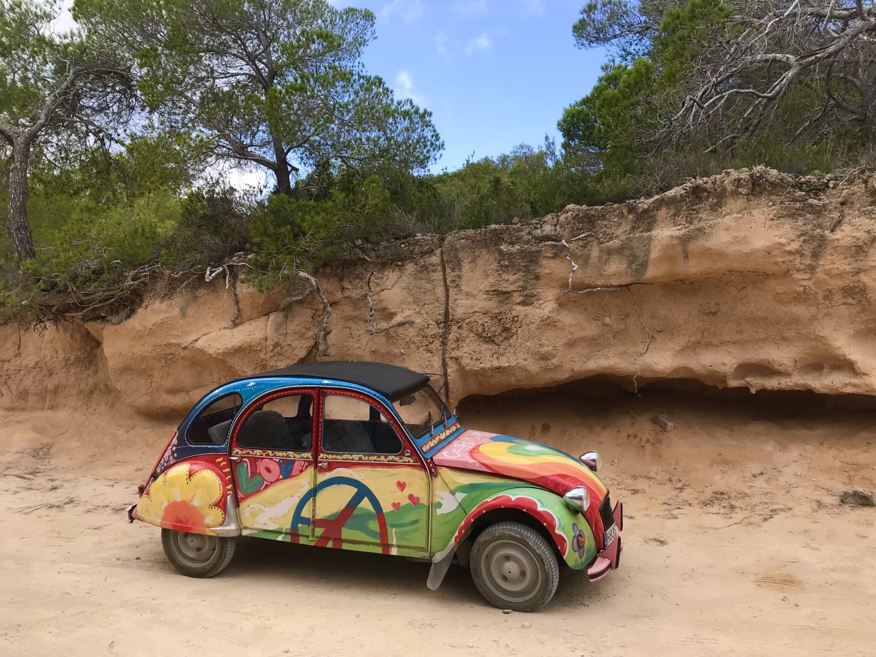 Caló d’En Serra daar moet je wezen tipte Jonathan me . Lekker klein baaitje een verwaaid strandtentje vind je vast tof ..waar ? .in het Noorden van Ibiza . Je rijdt richting Portinatx en iets voor het dorp pak je de eerste afslag naar rechts . Een zandweggetje bezaaid met kuilen en hobbels slingert je naar het strandje . In een 2cv voelt de rit ernaartoe als een kermisatractie.