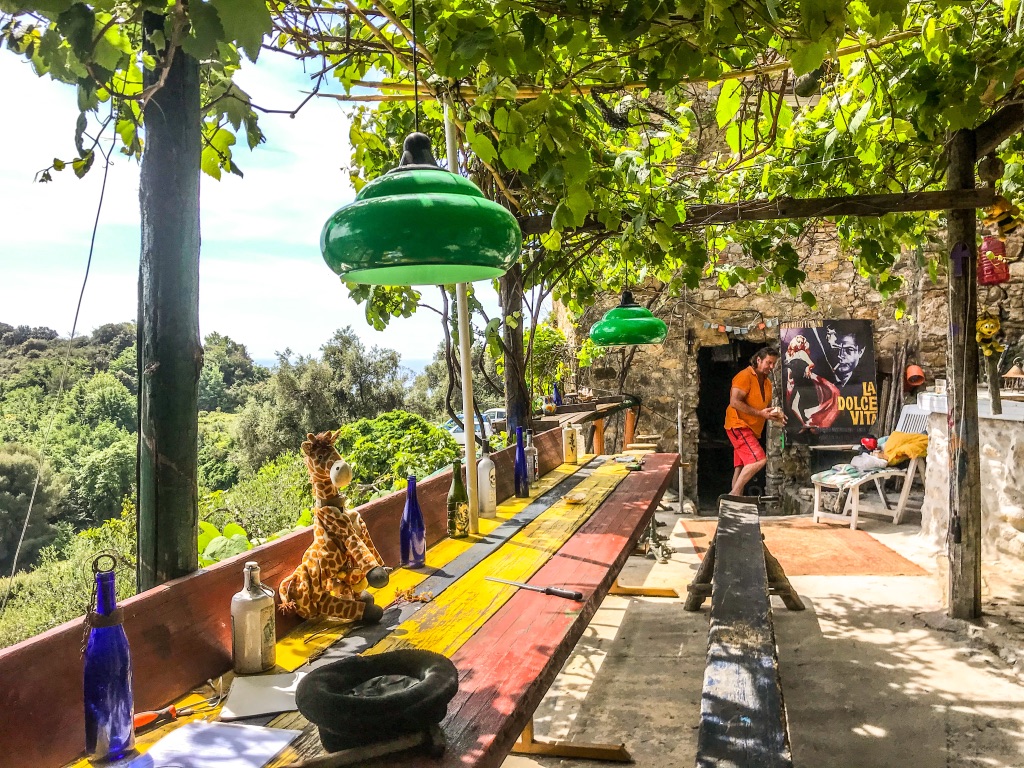 Casa la Barca Man – wat een ToffePlek – tegen het dorp Bussana Vecchia aangeplakt als een zwaluwnest van vintage drijfhout – magistraal uitzicht over de de vallei en de Middellandsezee – wat is het ? kruising tussen een cafe -restaurant zonder menu – filosofieclub -stayokay- bibliotheek en rommelmarkt – het word gerund door de Italiaanse Davide en de Nederlandse Ronald – Ronald : ” man wat ben je druk – hier neem ff een glas wijn en ga zitten ” Toffe gasten