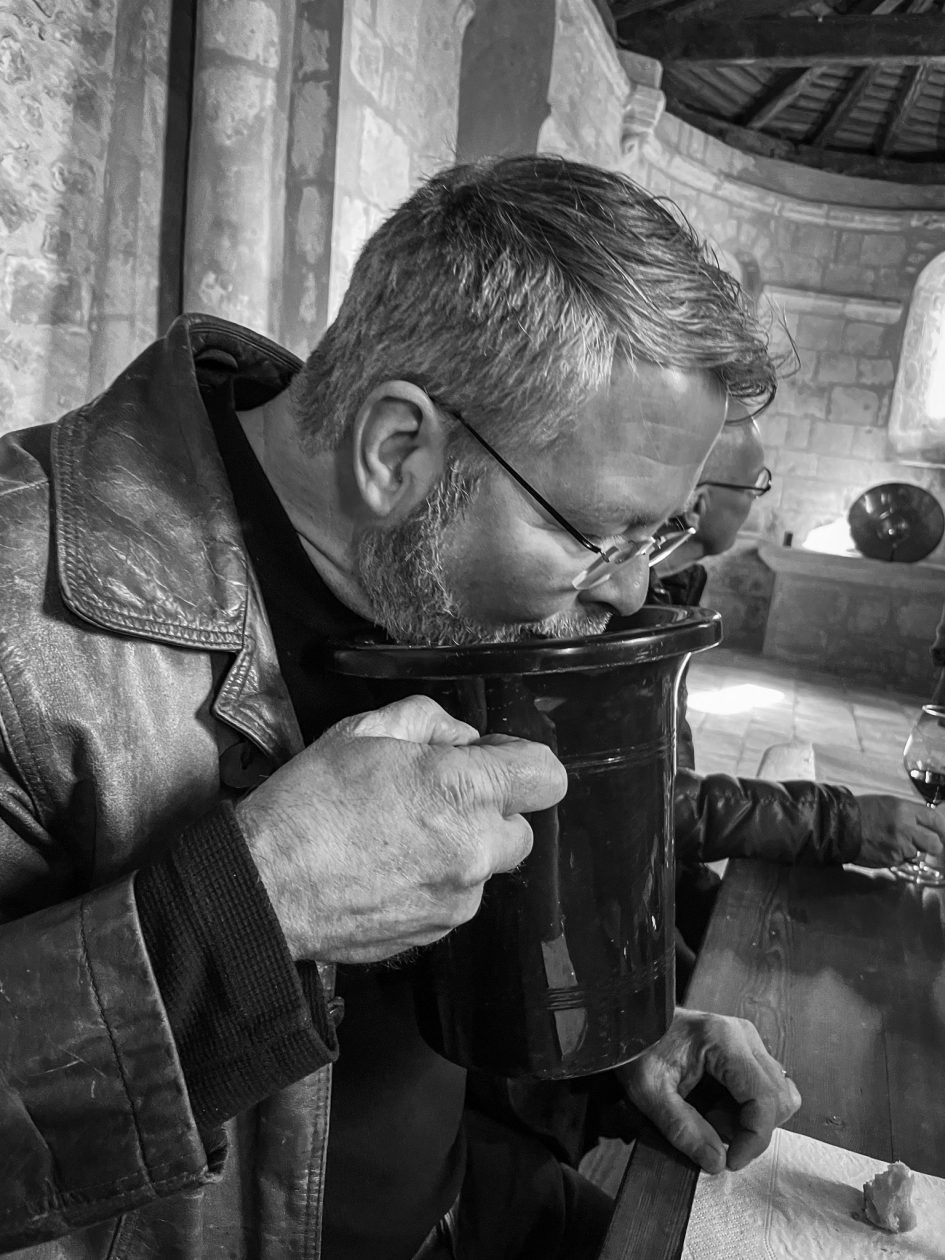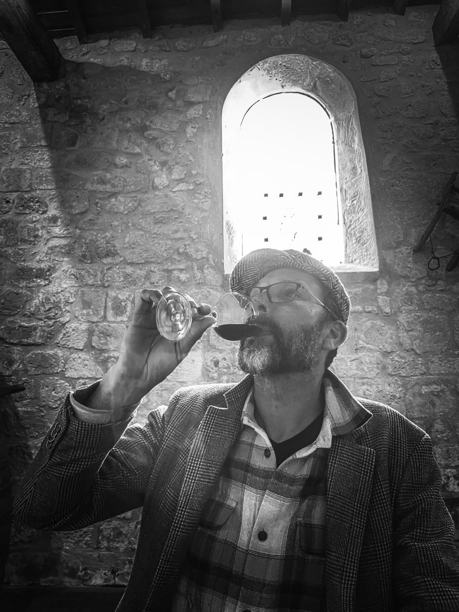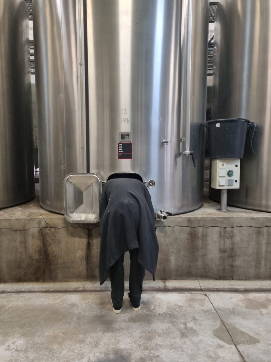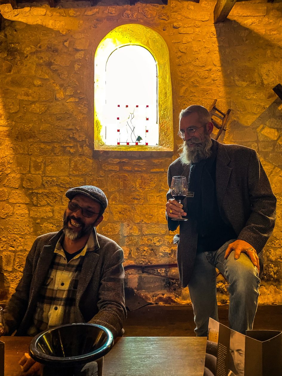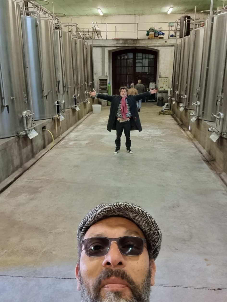 We gaan vandaag wijn kopen bij een vriendin van Jeroen en Annemarie. Ze komt uit Zweden en managet Chateau d’Escurac – er is een lichte paniek op het Chateau – de druiven hangen rijp en vol aan de ranken en er is vanavond nachtvorst voorspeld – merde! Tussen de velden liggen hooibalen die bij vorst in de fik gaan om de vorst te verdrijven – in 2021 ging 70% van de oogst naar de knoppen door vorst (-7 in april). Het maken van de wijn verloopt verders hypermodern en clean, maar de weg van natuur is soms duister en onvoorspelbaar. We rennen opgewonden door het pakhuis – slurpen van de wijn – en spugen het een keer uit voor de foto.