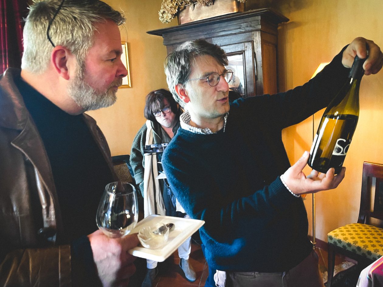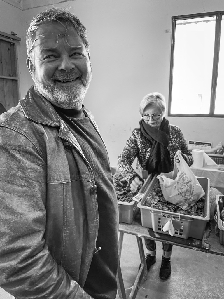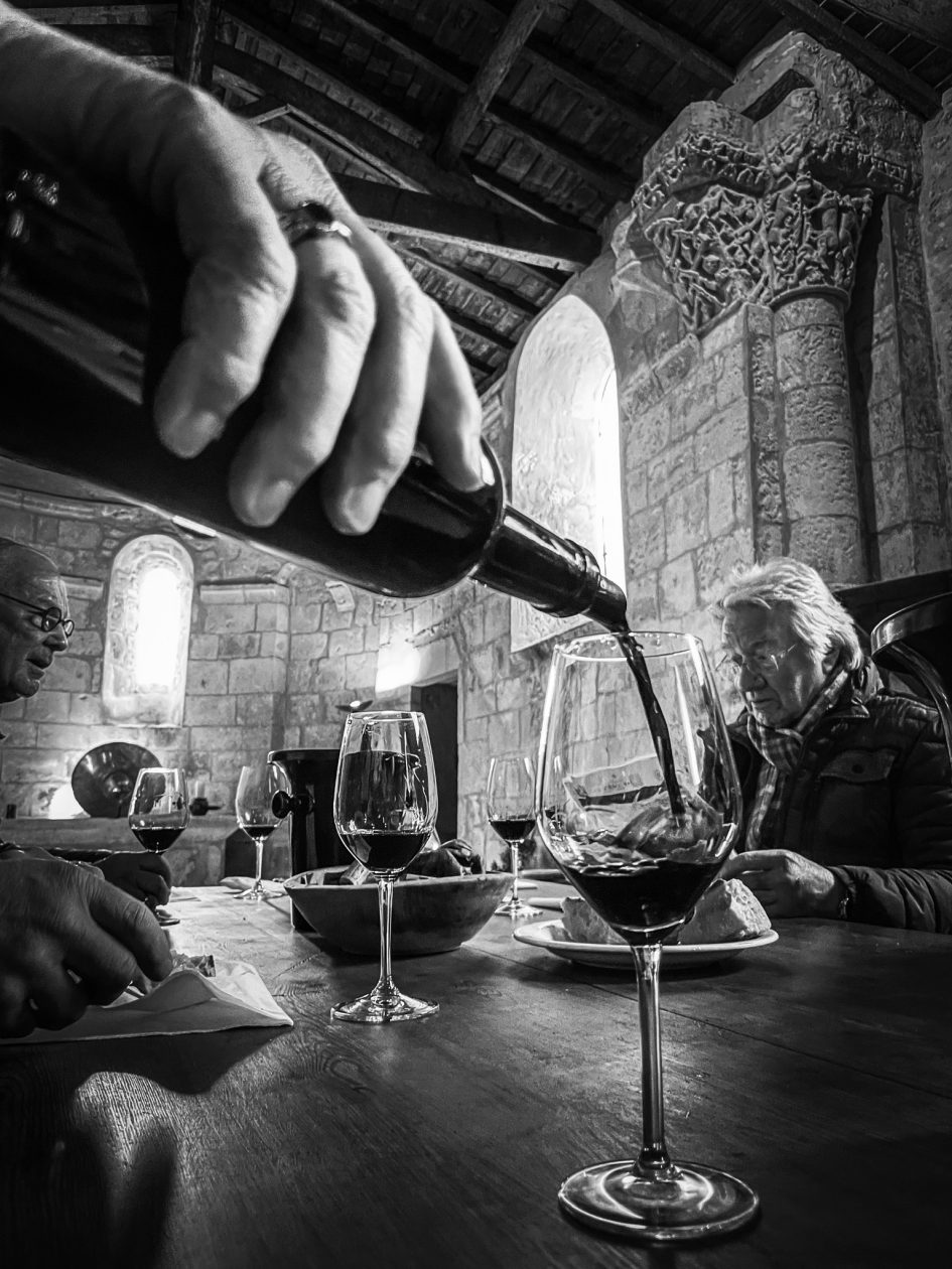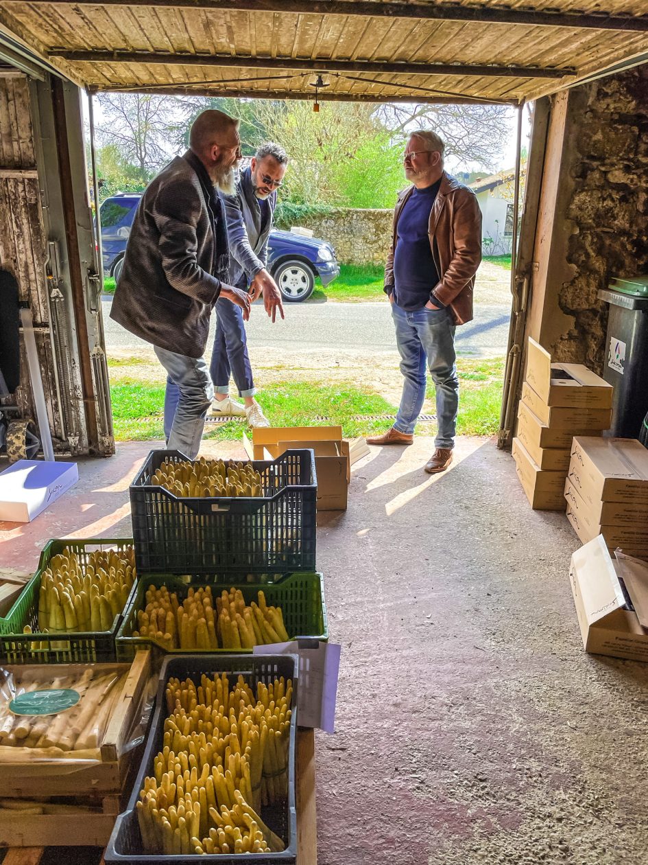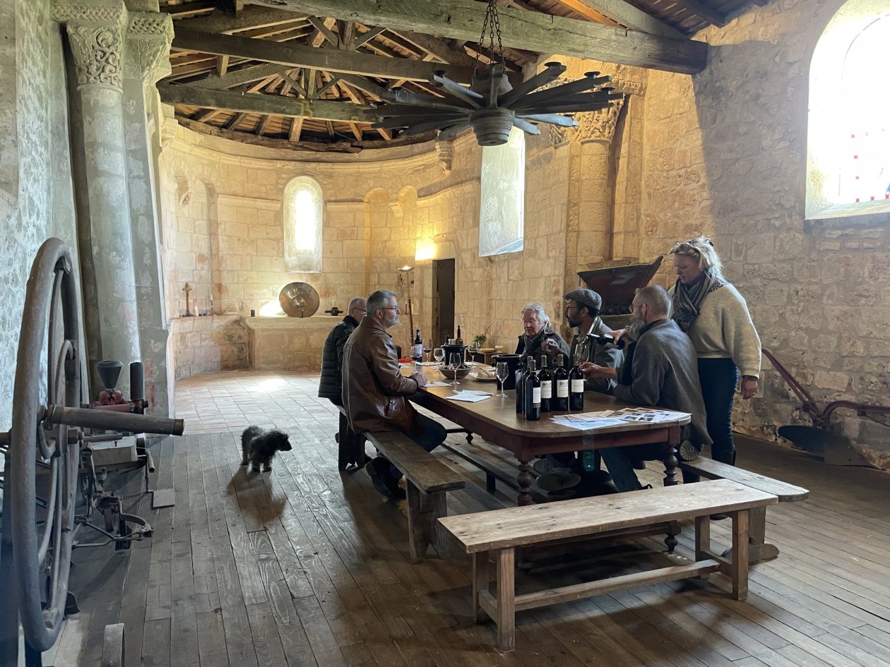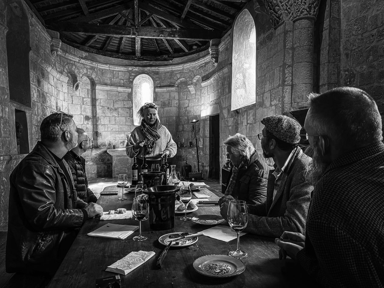 We gaan vandaag wijn kopen bij een vriendin van Jeroen en Annemarie. Ze komt uit Zweden en managet Chateau d’Escurac – er is een lichte paniek op het Chateau – de druiven hangen rijp en vol aan de ranken en er is vanavond nachtvorst voorspeld – merde! Tussen de velden liggen hooibalen die bij vorst in de fik gaan om de vorst te verdrijven – in 2021 ging 70% van de oogst naar de knoppen door vorst (-7 in april). Het maken van de wijn verloopt verders hypermodern en clean, maar de weg van natuur is soms duister en onvoorspelbaar. We rennen opgewonden door het pakhuis – slurpen van de wijn – en spugen het een keer uit voor de foto.