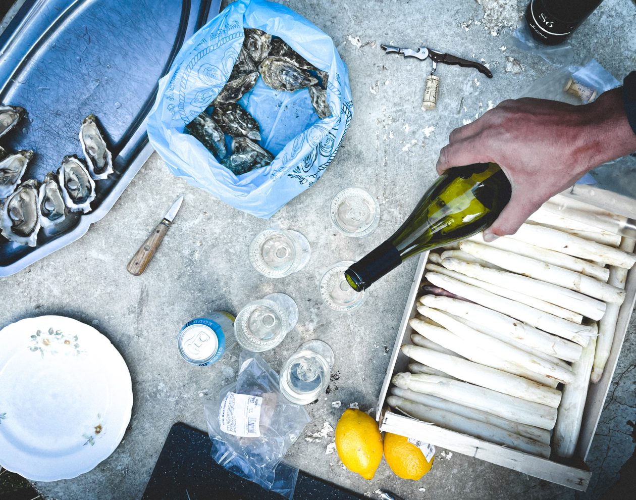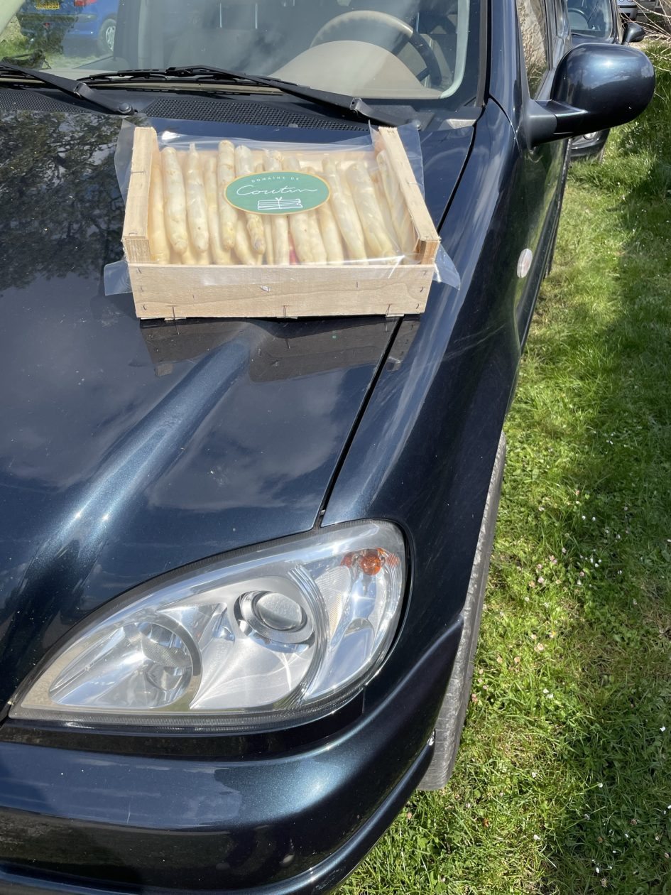 Saint-Laurent-Médoc is een dorpje van niks en voor je het weet rij je er weer uit – toch zijn er op zondag twee plekken waar je verse oesters uit het Bassin van Arcachon kan kopen – er staat een wijnboer naast die uit zijn bestelauto bijpassende wijn verkoopt – iets verderop staan de deuren van een woonhuis open – hier kan je asperges proeven en kopen – natuurlijk staat hier ook een weer een wijnboer met bijpassende wijnen – er word geslurpt – goedkeurend geknikt en de koop gesloten – de achterklep van onze auto kan nog maar net dicht – de zondag lunch is binnen – rustig aan, doucement.