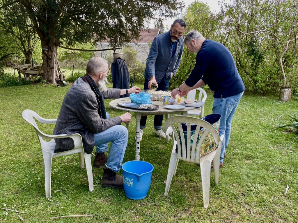 Een keer per jaar gaan we met z’n drieën naar Bordeaux – 12 uur rijden en bijkletsen – ouwe koeien uit de sloot halen en verse verhalen over gevoel – gezin – vriendschap en werk – 12 uur in een auto klinkt lang, maar voor ons voelt het kort –  drie nachten logeren we bij Jeroen en Annemarie – ouwe vrienden uit de studietijd – ze wonen er 30 jaar en zijn Franser dan de meeste Fransen – drie dagen ondergedompeld in hun Franse leven – ochtend met rijp op het gras – de zon komt op – rustig aan, doucement – de koffie loopt door – Karel haalt op de fiets stokbrood en croissants en voor mij – de zoetbek – een eclair.