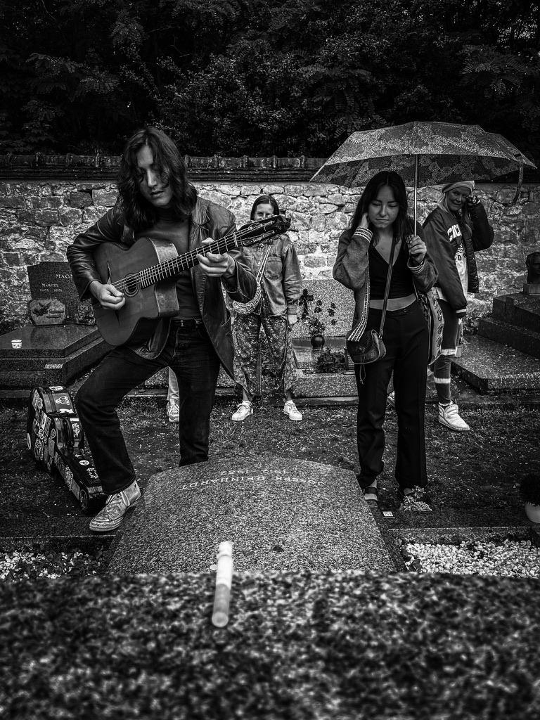 Django leeft! Hoewel je wel zijn graf kunt bezoeken in het naburige dorpje Samois-sur-Seine. Ook daar kwamen we een gitarist tegen uit LA die een ode gaf aan de gipsy jazzkoning, spelend met een plectrum dat op zijn grafsteen lag. Mijn zoon Django moest natuurlijk ook even voor zijn voormalige deur staan in Samois-sur-Seine / Rue du Bas Samois – je loopt er zo tegen aan, groene luiken met een gedenksteen tegen de gevel.