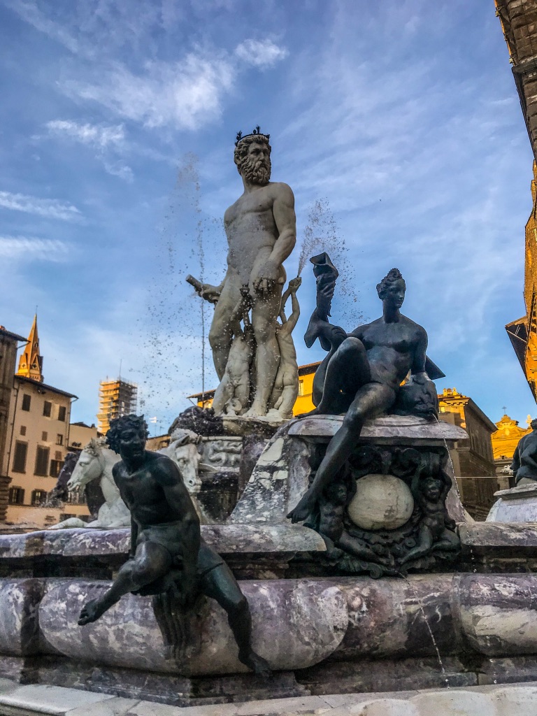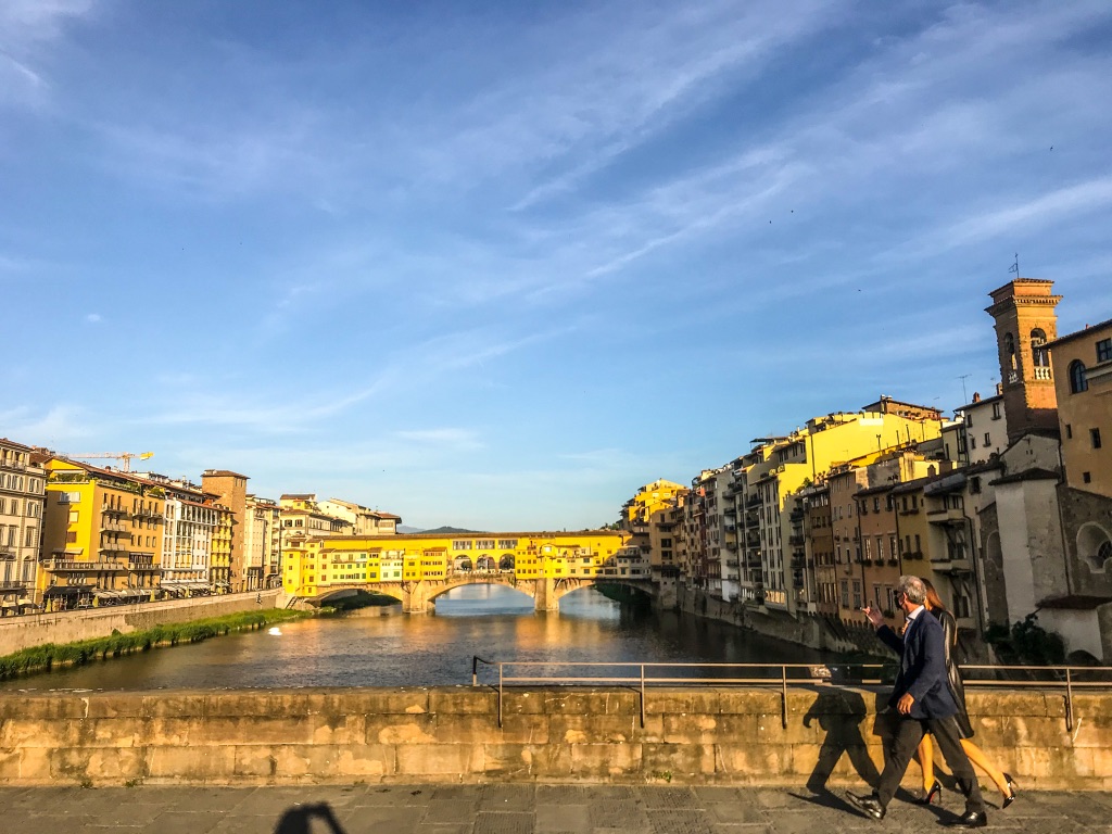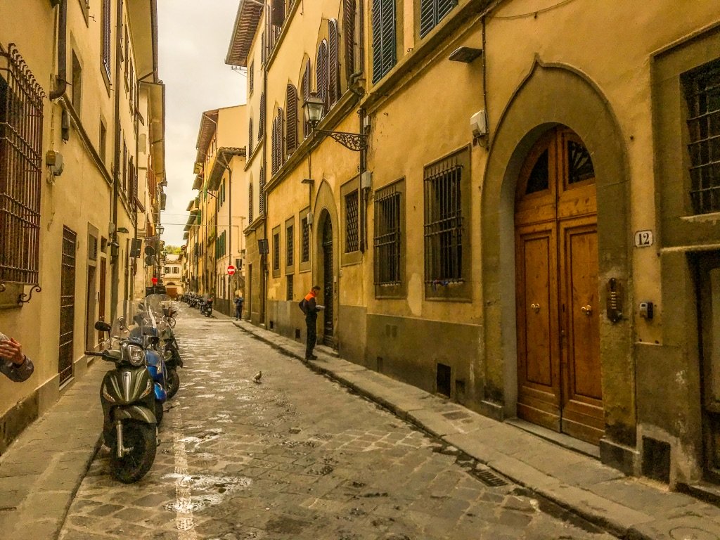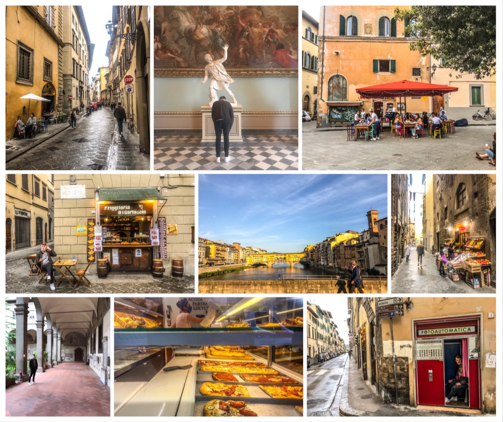 Kijken in het uffizi.it museum in Florence  met je neus boven op een Da Vinci of even op je gemak naar “De Geboorte van Venus” staren zonder gestoord te worden door andere bezoekers . Slapen deden we heel fijn en vredig  in een airbnb aan de rand van het Piazza Santo Spirito , een echt Italiaans pleintje zo uit een boek .Bomen voor de de schaduw ,terras voor de slok en hap  en op de kop een kerk . In de kerk werden heel vriendelijk door een pater rond geleid . Trots liet hij ons de houten christus gemaakt door Michelangelo zien en sleepte ons mee naar de geheime tuin . Beeldschoon om stil van te worden . We branden een kaars voor de Opa,s en Oma,s en gingen op de foto met de priester . We verdwaalde opzettelijk in het oude stadscentrum  en kwamen per ongeluk weer terug op ons eigen pleintje net op tijd voor een slok en een hap .