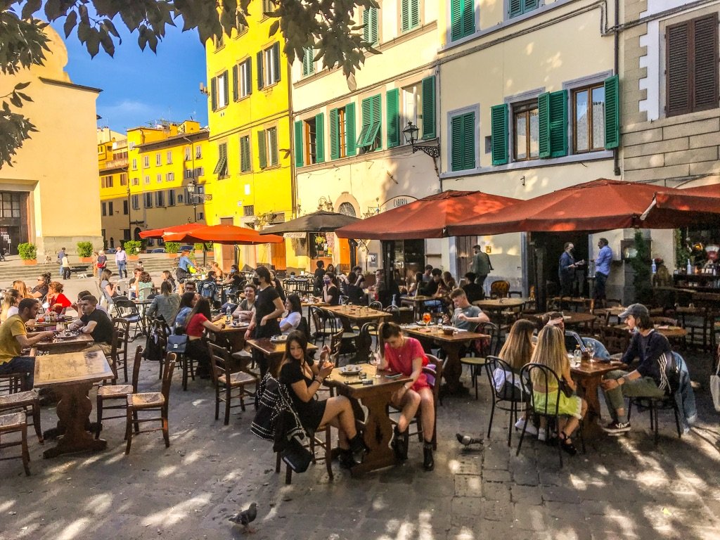 Kijken in het uffizi.it museum in Florence  met je neus boven op een Da Vinci of even op je gemak naar “De Geboorte van Venus” staren zonder gestoord te worden door andere bezoekers . Slapen deden we heel fijn en vredig  in een airbnb aan de rand van het Piazza Santo Spirito , een echt Italiaans pleintje zo uit een boek .Bomen voor de de schaduw ,terras voor de slok en hap  en op de kop een kerk . In de kerk werden heel vriendelijk door een pater rond geleid . Trots liet hij ons de houten christus gemaakt door Michelangelo zien en sleepte ons mee naar de geheime tuin . Beeldschoon om stil van te worden . We branden een kaars voor de Opa,s en Oma,s en gingen op de foto met de priester . We verdwaalde opzettelijk in het oude stadscentrum  en kwamen per ongeluk weer terug op ons eigen pleintje net op tijd voor een slok en een hap .