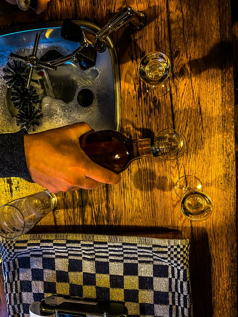 De kastelein schenkt gul en met plezier je borrel of likuur in een geeft je een bodempje moutwijn van 18 jaar oud om het verschil te proeven – als het schemert wandelen door een bos met z’n laatste bladeren langs de waterkant richting huis . Onderweg passeren we cafe/restaurant Polder wat er te gezellig uit ziet om niet even een kleine stop in te lassen – het vlees is week en de benen vermoeid – we houden het bij en glas – de volgende keer blijven we voor de hap .