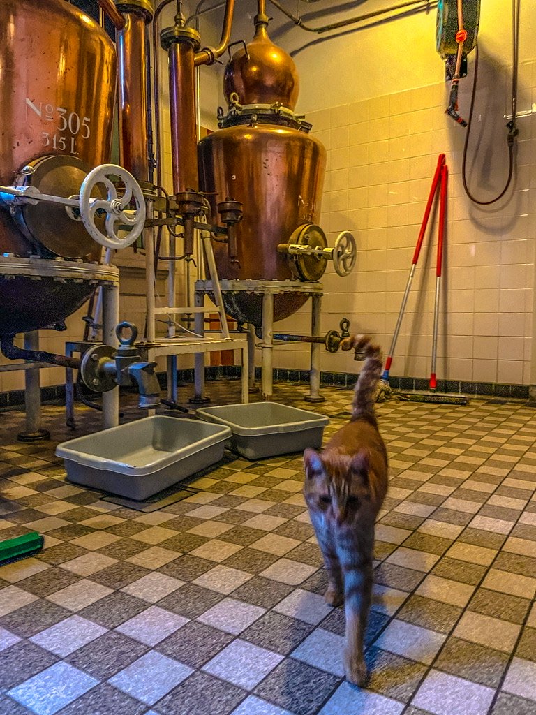 Distilleerderij T’ Nieuwe Diep in het Flevopark aan de rand van de Indische buurt , distilleert en verkoopt hun fijne producten direct aan de dorstige onder ons vanuit een oud een beeldschoon gemaal- Vanaf het terras heb je uitzicht op het meertje tot de motregen ons naar binnen dreef – Amsterdamse osseworst met mosterd op een plank en een oude jenever ernaast – hier geen achtergrondmuziek of ingewikkelde cocktails – je drinkt hier /praat of mijmert – Neut , de huiskat loert met een oog naar onze worst en met het andere naar de honden buiten –