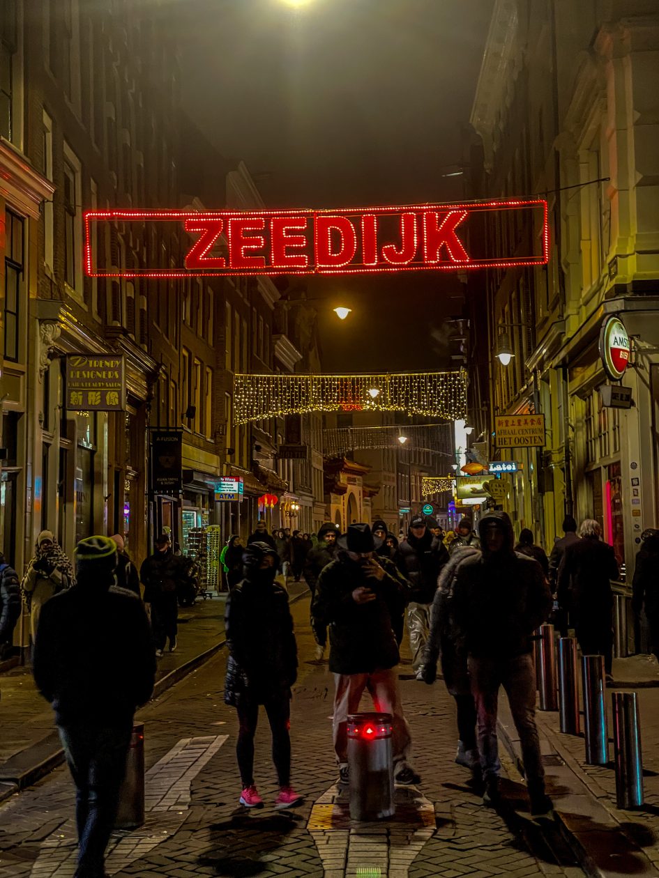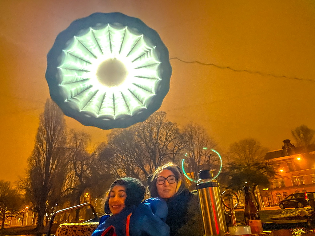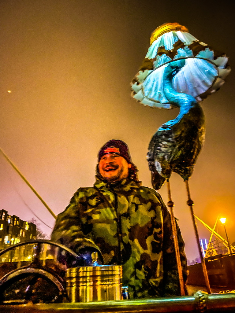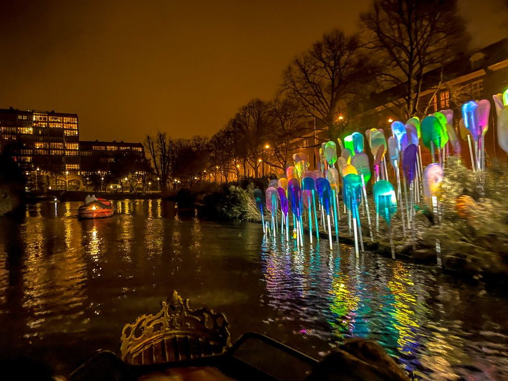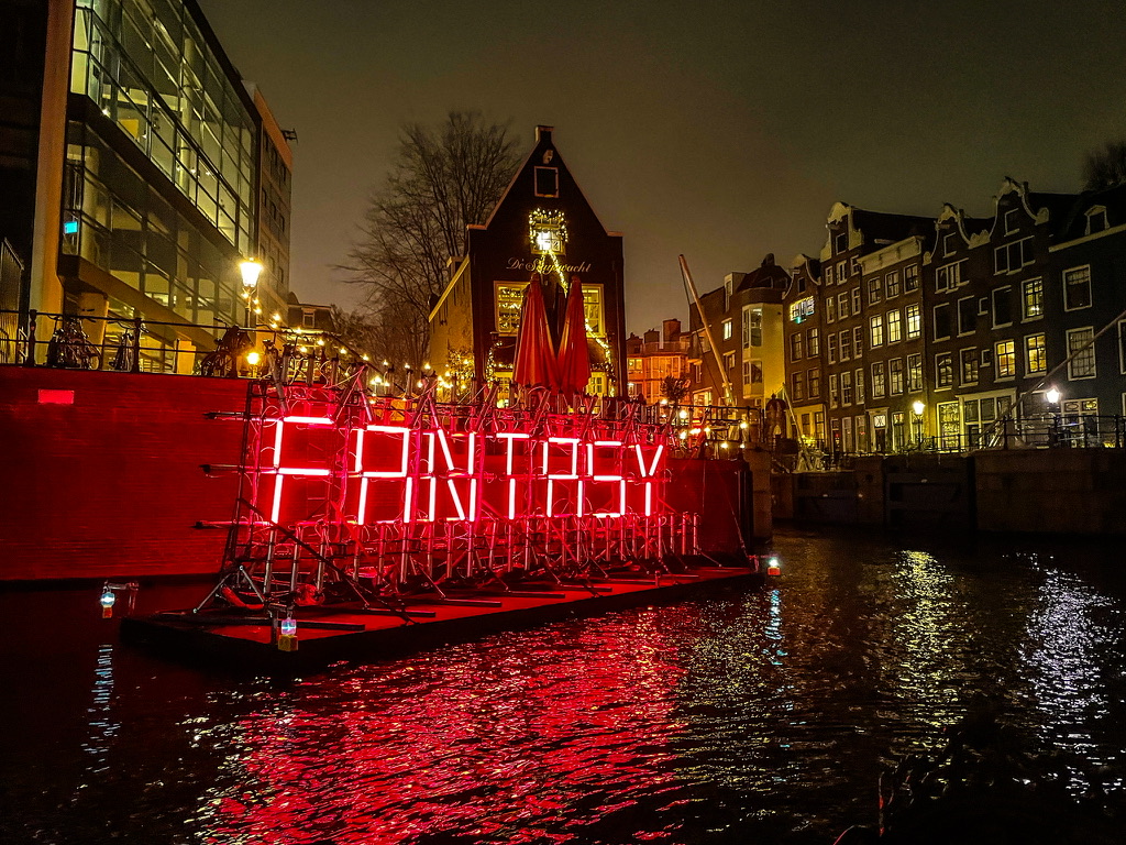Thermoskannen met warme snert /worst /glühwein / chocolademelk en een fles rum om de kou te verdrijven worden aan bord gezet en we duwen af – Camiel achter het stuur – wij fijn tegenover elkaar op de banken met een warme deken – Man , ook zonder de licht kunst objecten is zo’n tocht door nachtelijk Amsterdam al betoverend mooi – Vanaf het water is Amsterdam op zn best – Salonbootjes / grote rondvaartboten en vrijbuiters zoals wij snijden door de kanalen en echoën onder de bruggen door – Twee toffe uren later binden we de blije boot vast op zijn ligplaats en schieten we cafe T ‘Hooischip in voor een afzakkertje en een portie bitterballen – Amsterdam ik hou van jou –