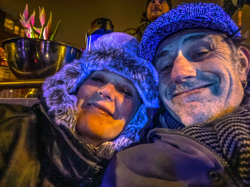 Amsterdam Light Festival 2022 – zaterdagavond 19;00 uur – de Nieuwmarkt is compleet in kerstsfeer en lijkt wel onderdeel van het festival -Het vriest in de stad en het glinster van de ijskristallen – magisch ! – Thuis hebben we alles wat warm is aangetrokken – je kan het Light Festival lopend doen – maar vriend Camiel nodigden ons uit om het met zijn blije boot te doen – zijn hond met de naam poes zag het niet zitten met deze temperaturen en bleef lekker thuis tegen de warme radiator liggen – Zus Janneke bereid dit soort trippies met militaire culinaire precisie voor –
