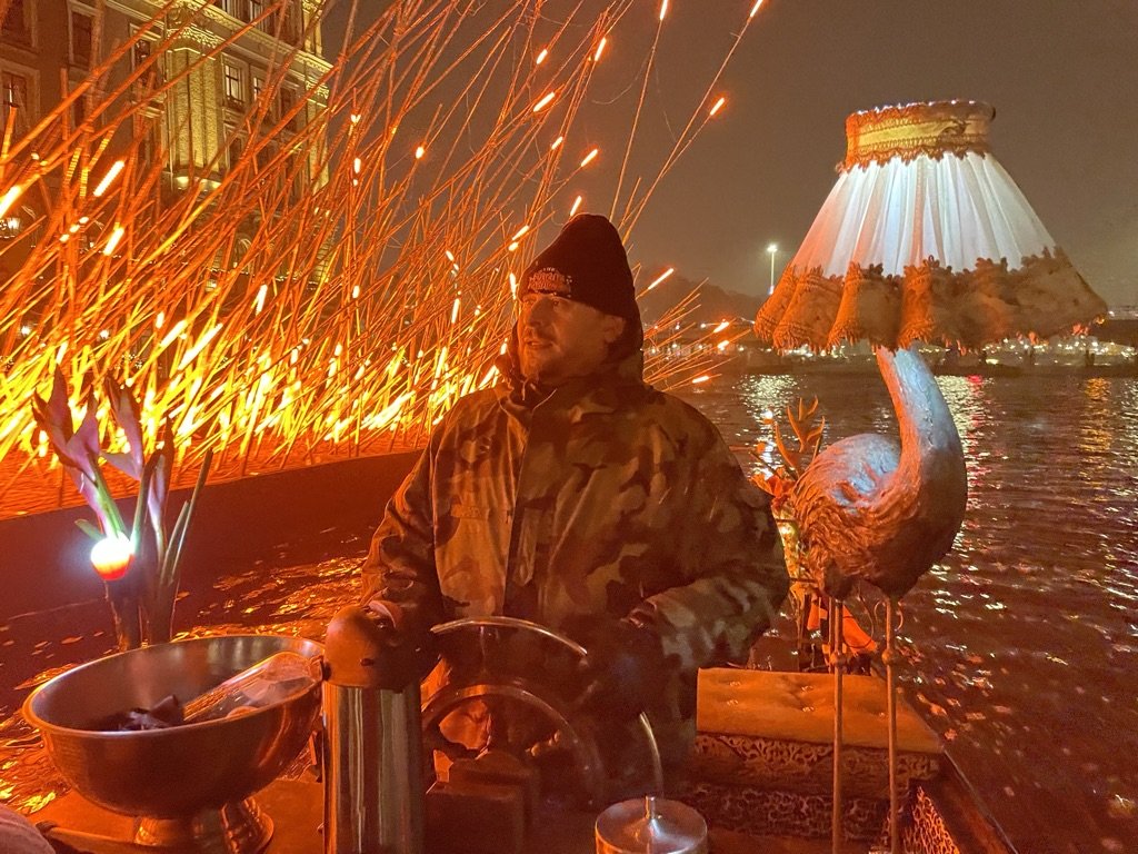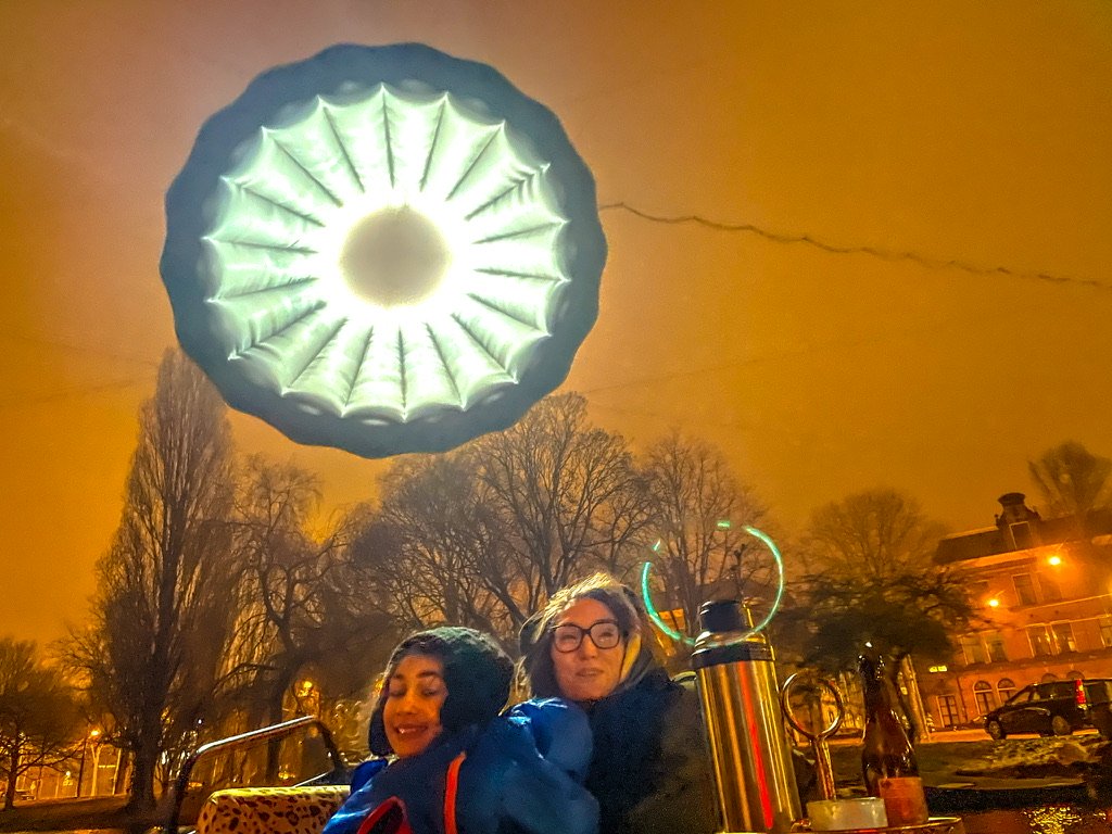 Amsterdam Light Festival 2022 – zaterdagavond 19;00 uur – de Nieuwmarkt is compleet in kerstsfeer en lijkt wel onderdeel van het festival -Het vriest in de stad en het glinster van de ijskristallen – magisch ! – Thuis hebben we alles wat warm is aangetrokken – je kan het Light Festival lopend doen – maar vriend Camiel nodigden ons uit om het met zijn blije boot te doen – zijn hond met de naam poes zag het niet zitten met deze temperaturen en bleef lekker thuis tegen de warme radiator liggen – Zus Janneke bereid dit soort trippies met militaire culinaire precisie voor –