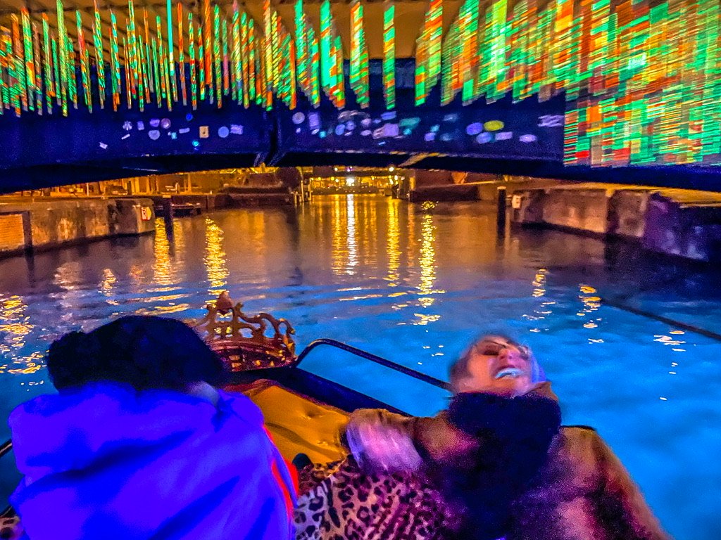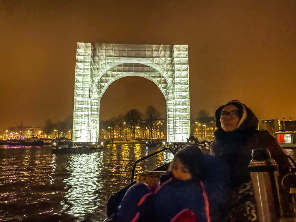 Thermoskannen met warme snert /worst /glühwein / chocolademelk en een fles rum om de kou te verdrijven worden aan bord gezet en we duwen af – Camiel achter het stuur – wij fijn tegenover elkaar op de banken met een warme deken – Man , ook zonder de licht kunst objecten is zo’n tocht door nachtelijk Amsterdam al betoverend mooi – Vanaf het water is Amsterdam op zn best – Salonbootjes / grote rondvaartboten en vrijbuiters zoals wij snijden door de kanalen en echoën onder de bruggen door – Twee toffe uren later binden we de blije boot vast op zijn ligplaats en schieten we cafe T ‘Hooischip in voor een afzakkertje en een portie bitterballen – Amsterdam ik hou van jou –