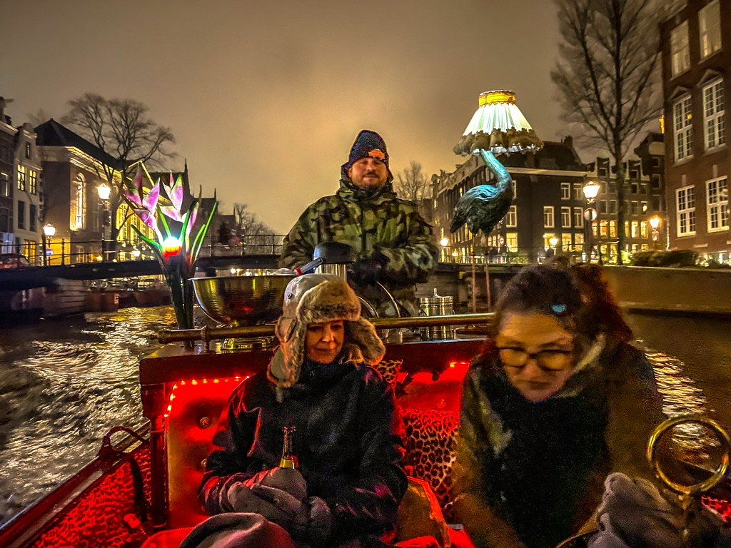 Thermoskannen met warme snert /worst /glühwein / chocolademelk en een fles rum om de kou te verdrijven worden aan bord gezet en we duwen af – Camiel achter het stuur – wij fijn tegenover elkaar op de banken met een warme deken – Man , ook zonder de licht kunst objecten is zo’n tocht door nachtelijk Amsterdam al betoverend mooi – Vanaf het water is Amsterdam op zn best – Salonbootjes / grote rondvaartboten en vrijbuiters zoals wij snijden door de kanalen en echoën onder de bruggen door – Twee toffe uren later binden we de blije boot vast op zijn ligplaats en schieten we cafe T ‘Hooischip in voor een afzakkertje en een portie bitterballen – Amsterdam ik hou van jou –