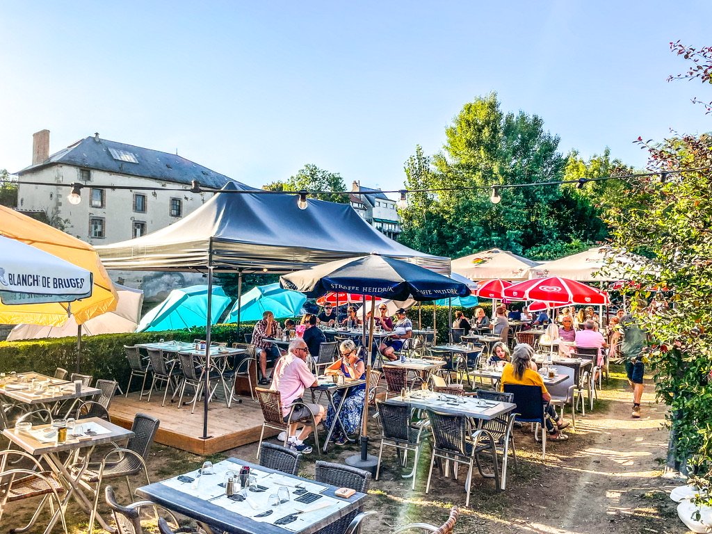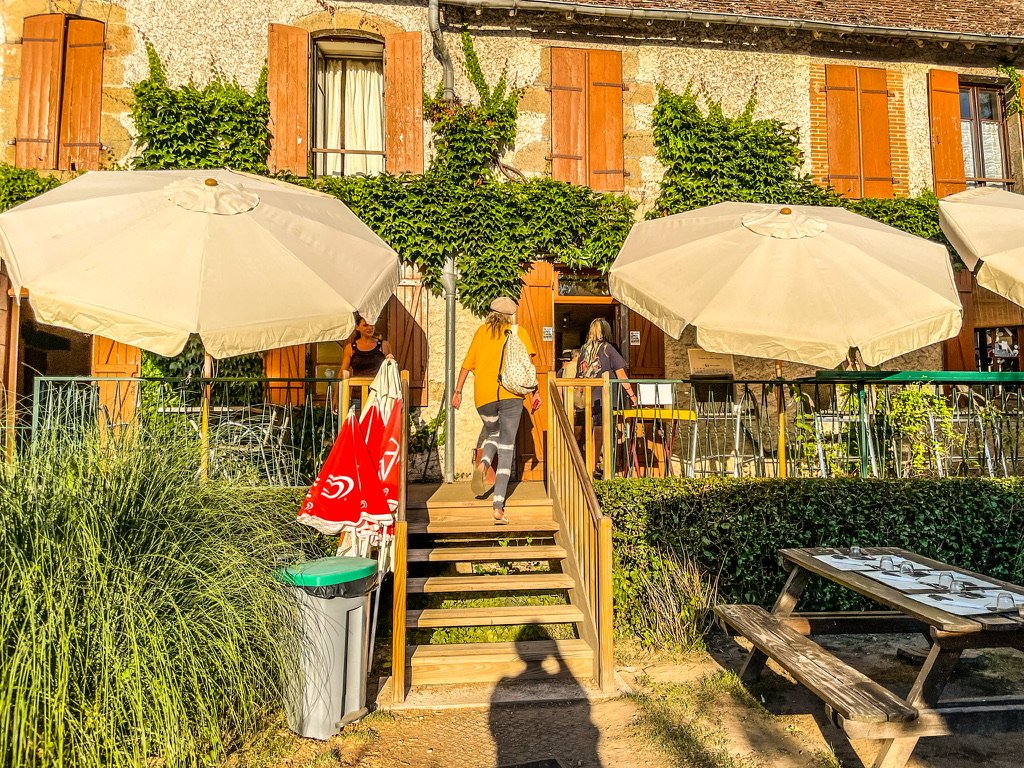 La Celle Dunoise – camping municipal Le Baignade – er ligt ongeveer 1 miljoen km weg in Frankrijk – de door ons gekozen km,s brachten ons heel “ Doucement” naar camping municipal le Baignade – goedgekozen naam want onder aan de camping slingert de rivier Creuse heel bevallig en fijn van temperatuur door het dorpje – op de deur van de wc hangt een tekst : we zijn er niet zoek maar een plekkje tot later- god wat hou ik toch van Frankrijk – een verliefde Ier uit Cork is een restaurant begonnen “Check facebook.com van Auberge des Pecheurs” met zijn franse lief aan de oever van de rivier met uitzicht op de kerk- de koster gaat minuten lang avec plezier los op de kerkbel- ondertussen worden onze glazen bijgevuld en dan heb je met zo ,n enthousiaste koster toch meer geduld.