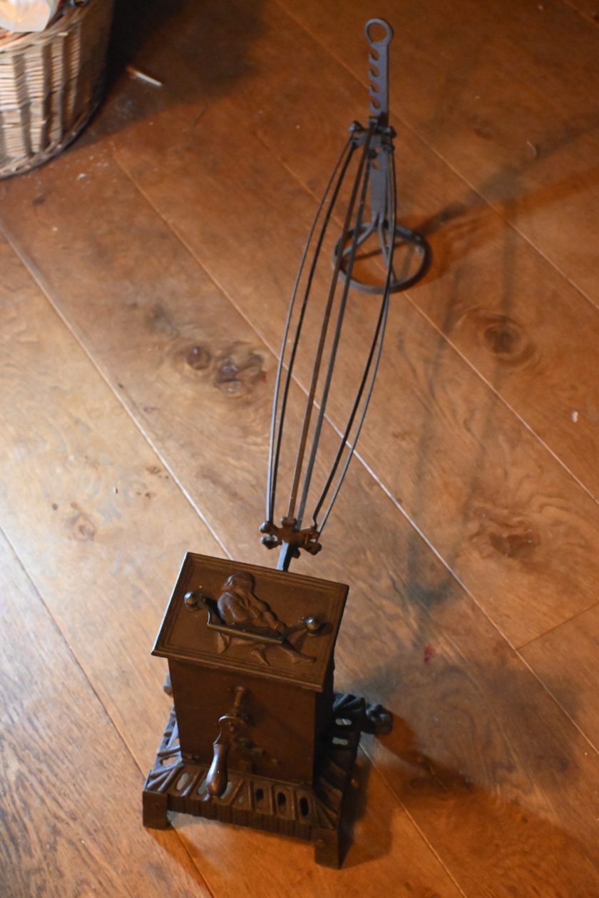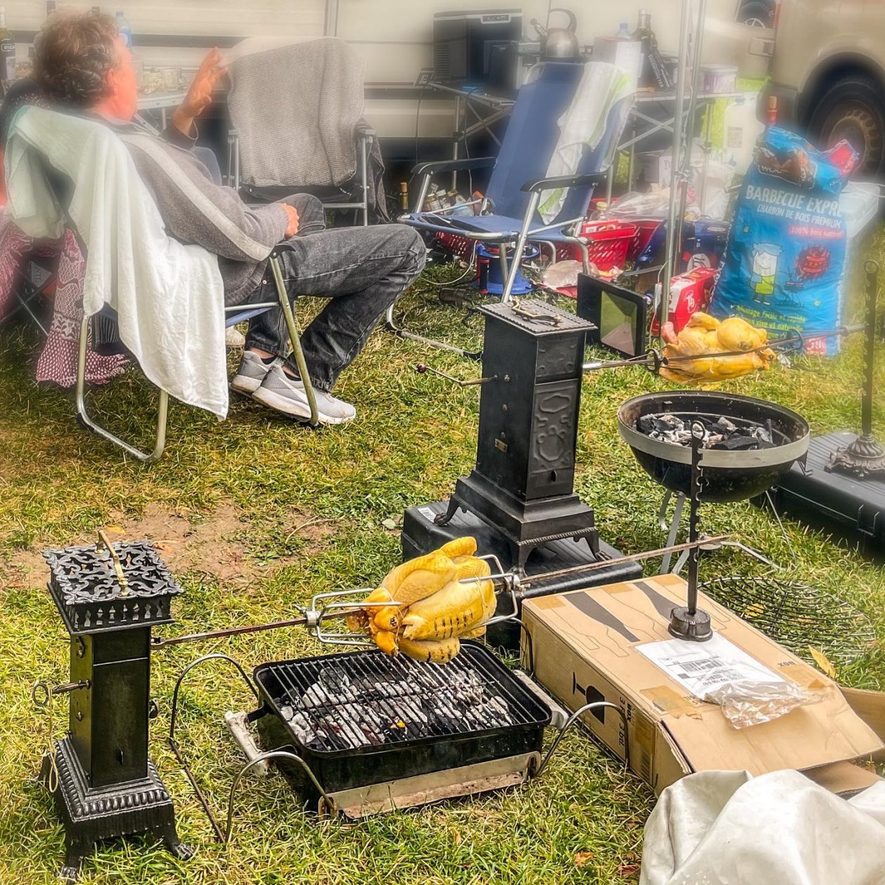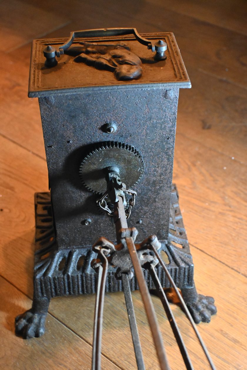 Gebraden kippenklok dekt de lading – maar net zoals vork/ vuilnisbak/spoorweg/ kater en snor is het Franse woord ervoor mooier -tournebroche – wat ik ervan gehoord heb is dat ze door klokkenmakers gemaakt werden – logisch- je heb ze in diverse afmetingen – die van ons komen uit 1860 – 1872 – maar draaien nog een steeds perfecte gebraden kippen – een tres charmant belletje geeft aan waaneer je hem weer moet opwindend-