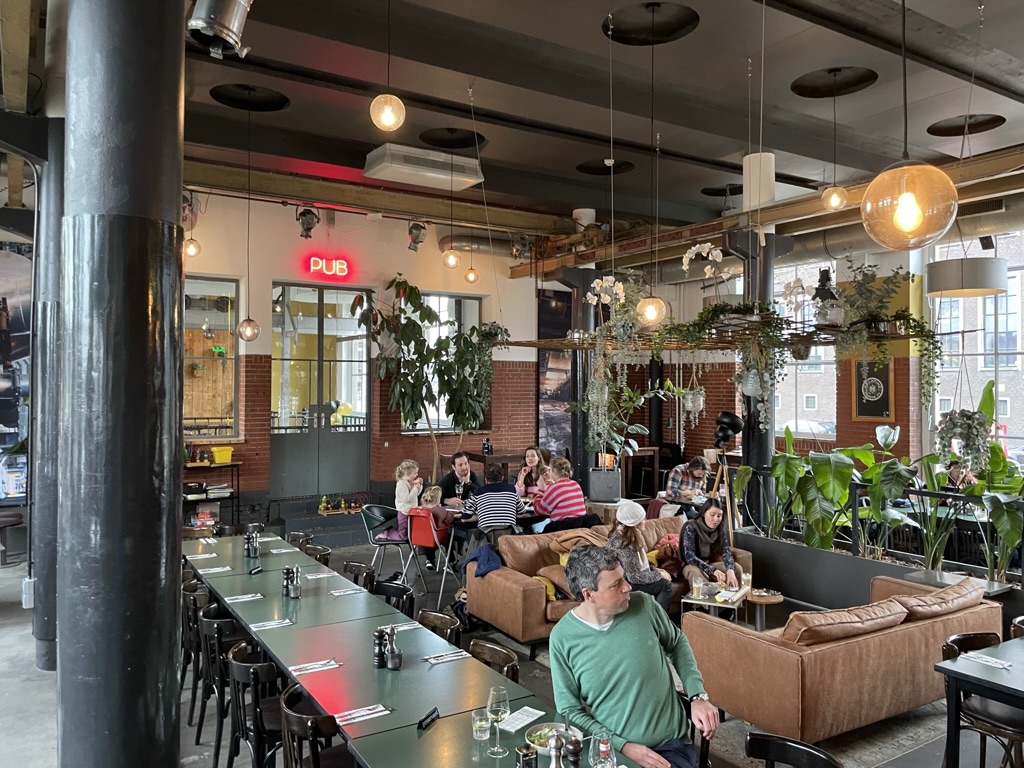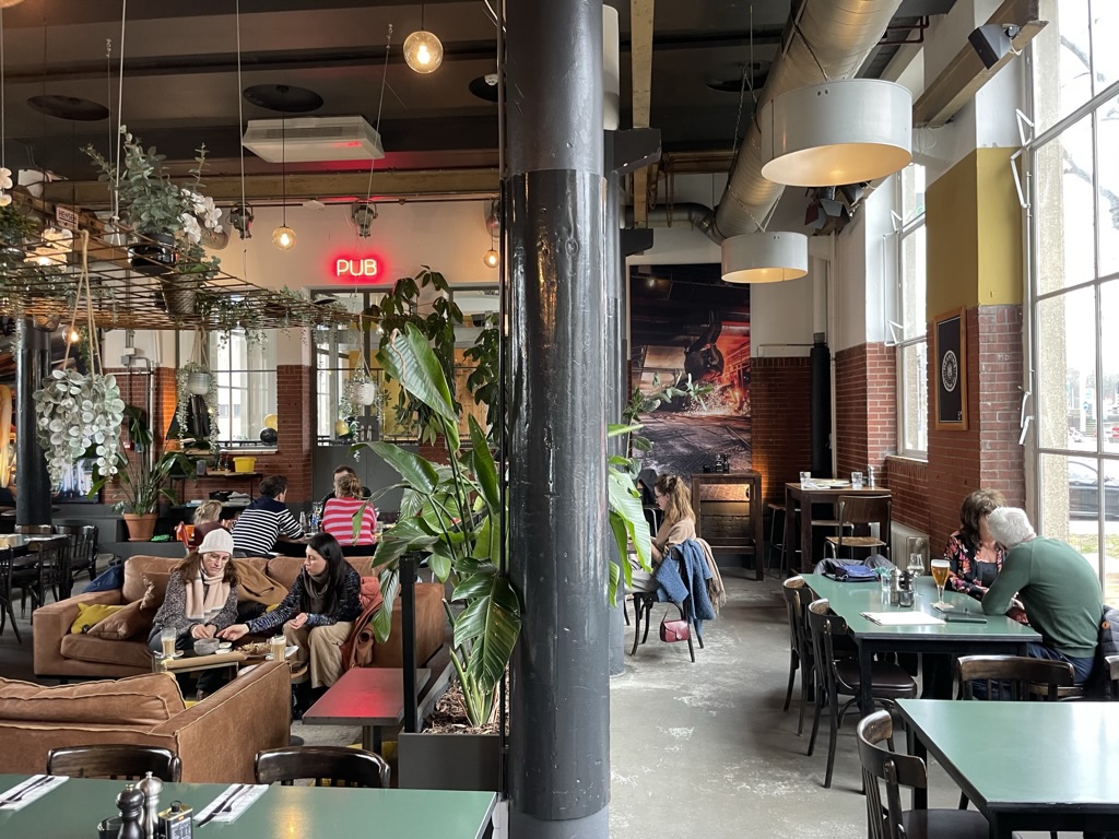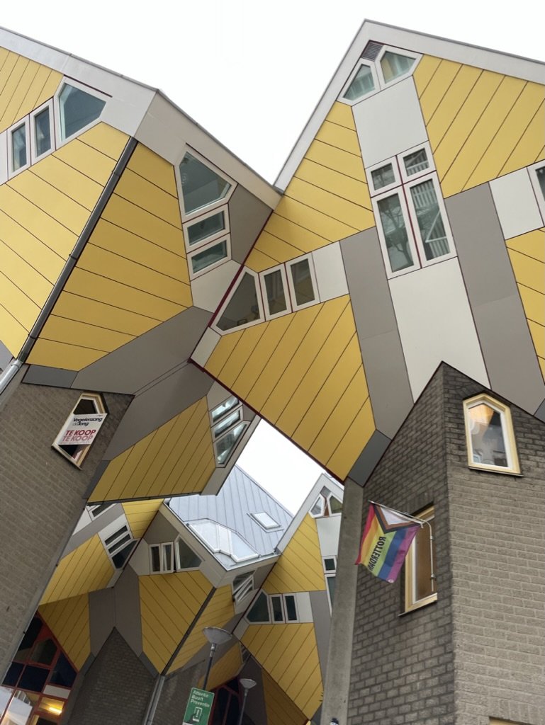 Van kunst beleven krijg je honger en dorst – Restaurant de Machinist is een lekkere plek om bij te komen van overdosis kunst – lekker makkelijke sfeertje – hip en bejaard door elkaar en een lekkere menukaart om uit te kiezen – fijne bediening met een lach – dus we bleven langer dan een glas – overnachten in 010 was de beste optie – in de iconische kubus woningen naast de Markthal bleek een Stayokay te zitten – prijs dik Okay en om het thema van de dag maar even door te zetten – je slaapt in kunst –