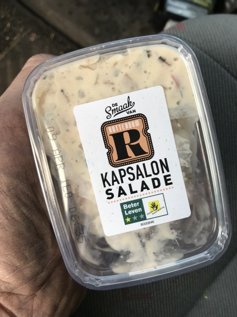 Omdat de kapper  graag gesmolten kaas wilden werd alles laag voor laag in een aluminium bakje gelegd waarna het even onder de grill werd gezet om de kaas te laten smelten – daarna de salade erop en een paar strepen knoflook sauce – door de frequentie van zijn bestellingen werd de machtige snack “Kapsalon” genoemd – prachtige verhaal –  een normaal portie bevat ongeveer 1200 kcal – er zijn een krankzinnig aantal varianten te verkrijgen en de Kapsalon is een ware zegetocht door de wereld aan het maken- Waar een klein land vet in kan zijn –