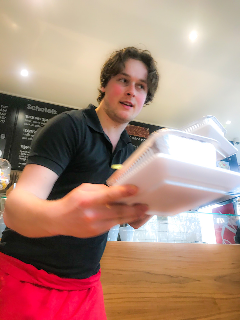 Everyone agrees on where the “Kapsalon” ( hairdresser Salon )  was born – Rotterdam – the story goes that the owner of a hairdressing salon ordered lunch with all his favorite ingredients in at the fastfood restaurant in his street  – French fries, shawarma, cheese, salad with on it a generous layer of garlic sauce –