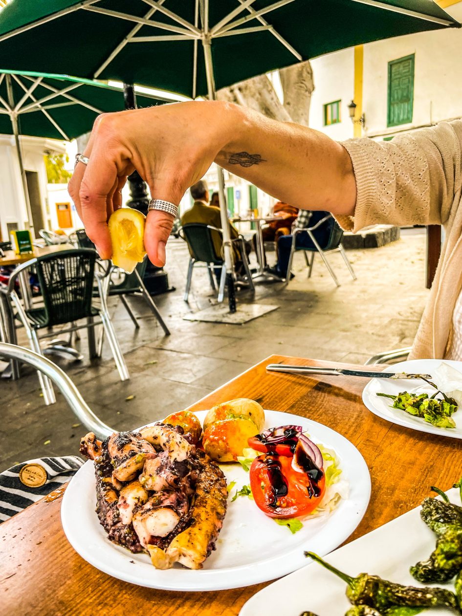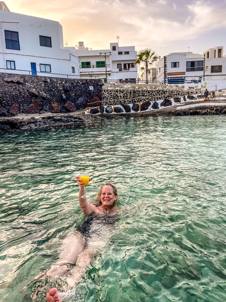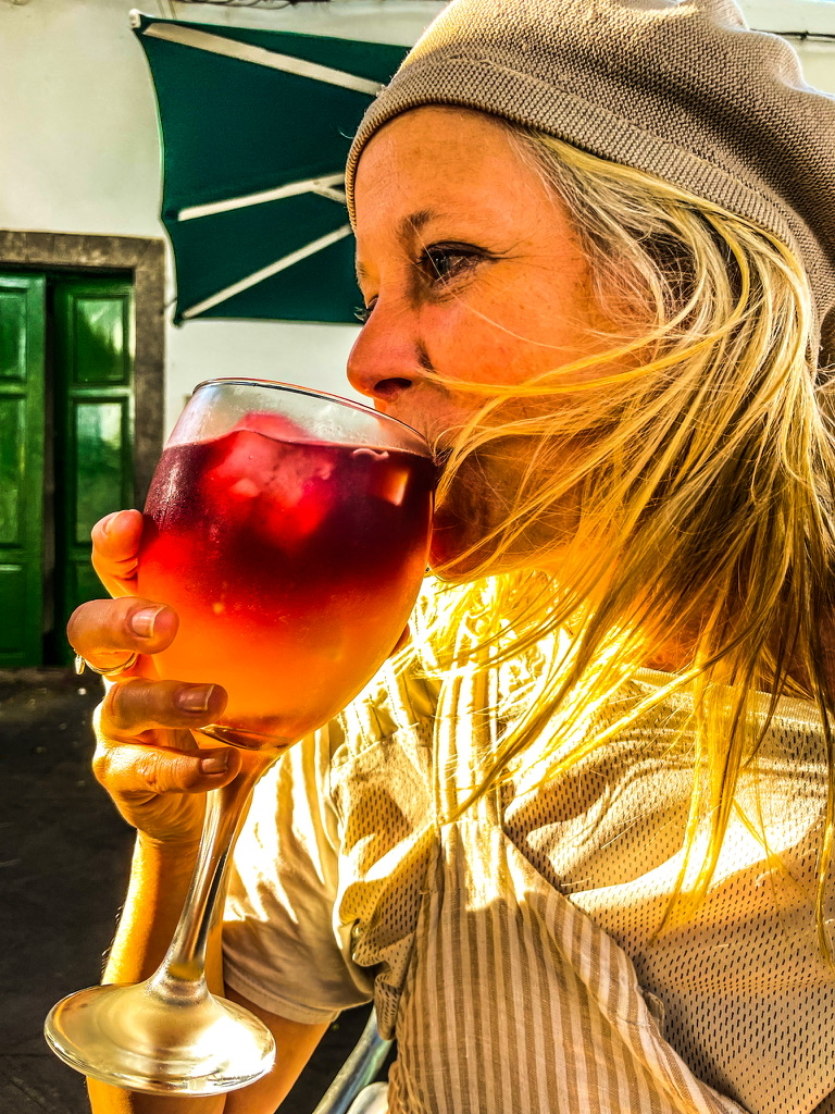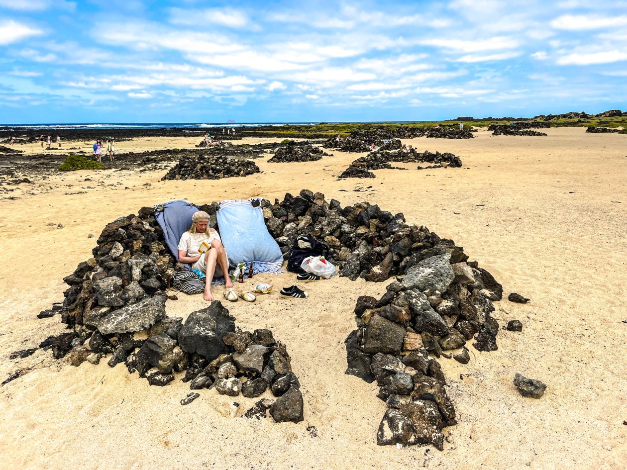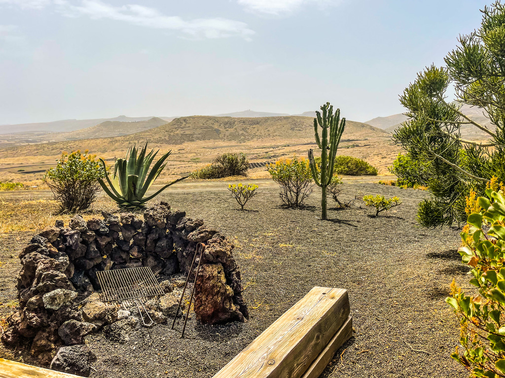 Lanzarote – ruig -rauwe vulkaan in de Atlantische oceaan – het aanwezige groen wacht met het geduld van een zen boeddhist op water – de grond is zwart het is 20 graden – ons logeer adres in het midden van een heerlijk niks heeft muren van vulkanisch steen en een uitzicht wat roept om een gedicht – de buren bestaan uit een roedel kippen met een poestige haan en een pluizige kat die kikker geluiden maakt – nieuwe amigos zijn snel gemaakt in deze omgeving –