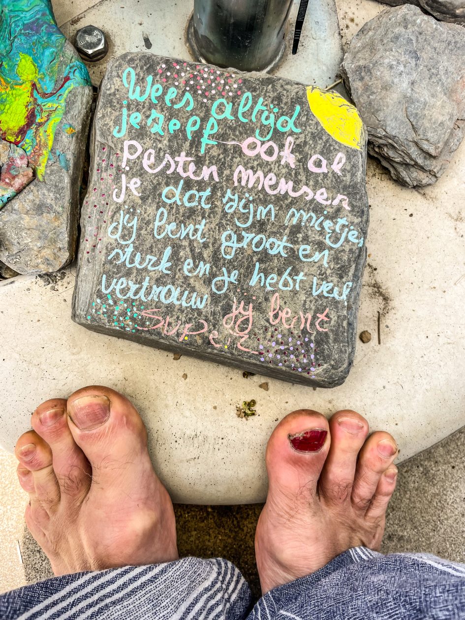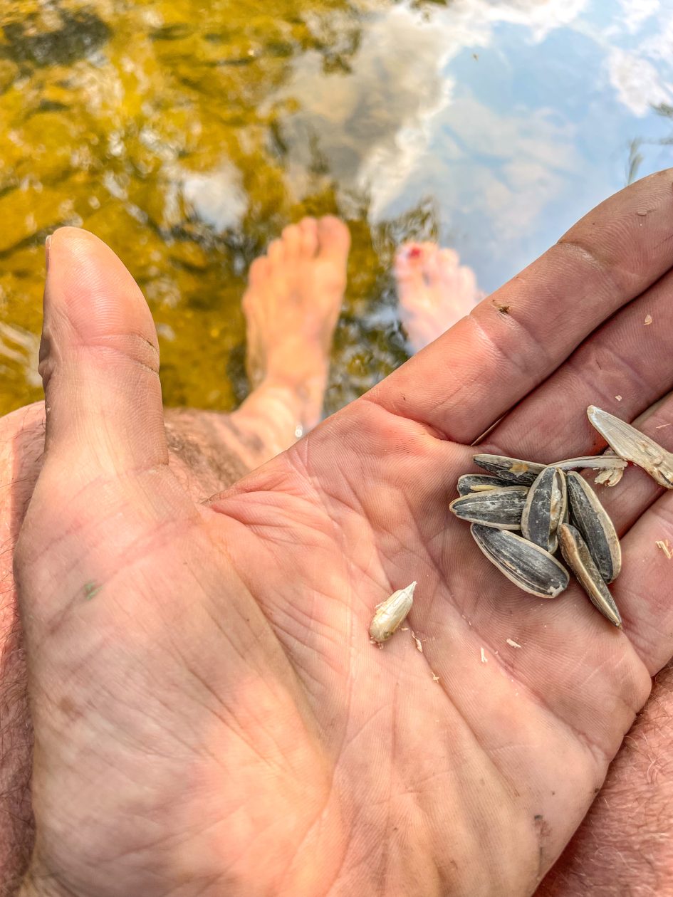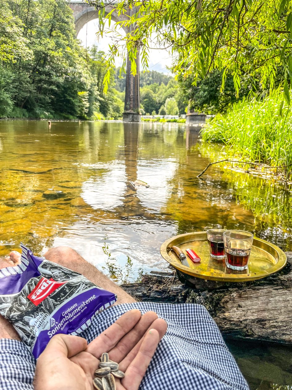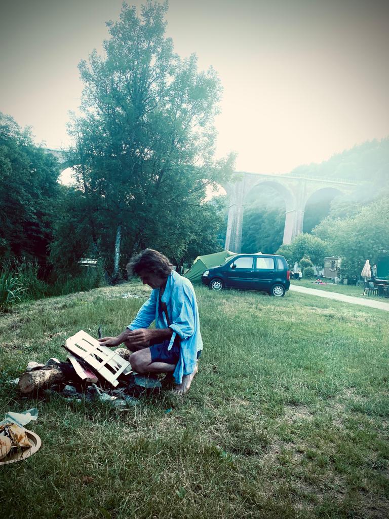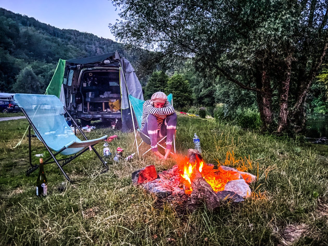 Murw na twee dagen in het oog van de Gipsy Jazz orkaan op het Django Reinhardt festival in Samoreau , avec plaisir , moet erbij gezegd worden – stopten we na 3 fijne uurtjes sturen iets over de Frans / Belgisch grens bij Camp le Monde / Arnocamps grounds aan de rivier de Semois – geheel of toch niet toevallig staat deze camping tjokvol prachtige gipsy woonwagens – tis ons thema deze trip – da,s duidelijk – stoelen en voeten in de rivier met als muziek de vogels in het bos – tis tof hier-Met mijn voeten in de Semois en bijtend in zonnebloempitten reis ik in gedachte af naar Baskenland – de zonnebloempitten en de kleine beloning van het secure bijten zetten me zo neer op een barkruk die met zijn vier poten in bergen lege zonnebloempit hulzen staat ergens in een cafe Noord Spanje – Pipas, zo noemen ze daar zonnebloempitten – ze hangen in elke kroeg en iedereen kauwt ze behendig leeg en spuugt de hulzen met een boog op de cafe vloer – ik hoorden of las ergens – pipas zijn voor mensen met veel tijd en weinig geld – Arno de eigenaar staat zelf met een brede glimlach achter de receptie – welkom met een smile – zoek maar een plekkie waar je je thuis voelt – fikkie stoken mag .