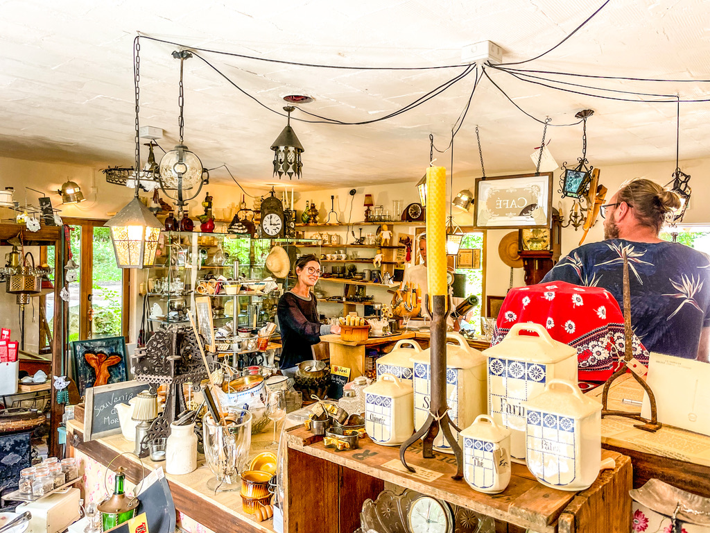 ‘Café-meets-brocante’ is het eerste wat dan in me opkomt, en het liefst met ons bed erin. Vier dagen later rijden we in de Morvan tegen ‘Petit Bonheur / Brocante Café’ van Monique en Elias aan. Binnen is het voor types zoals ik, die goed gaan op prikkels, een feest. Maar geen paniek: buiten op het terras, midden in het bos, zit je in een prikkelvrije zone met een koud drankje aan je lip. Superleuke plek! Ga er even kijken, winkelen en wat drinken. Als je een half uurtje doorrijdt, kom je vanzelf in Saint-Prix, waar Victor zijn bier brouwt en verkoopt in Café Le Braconnier.