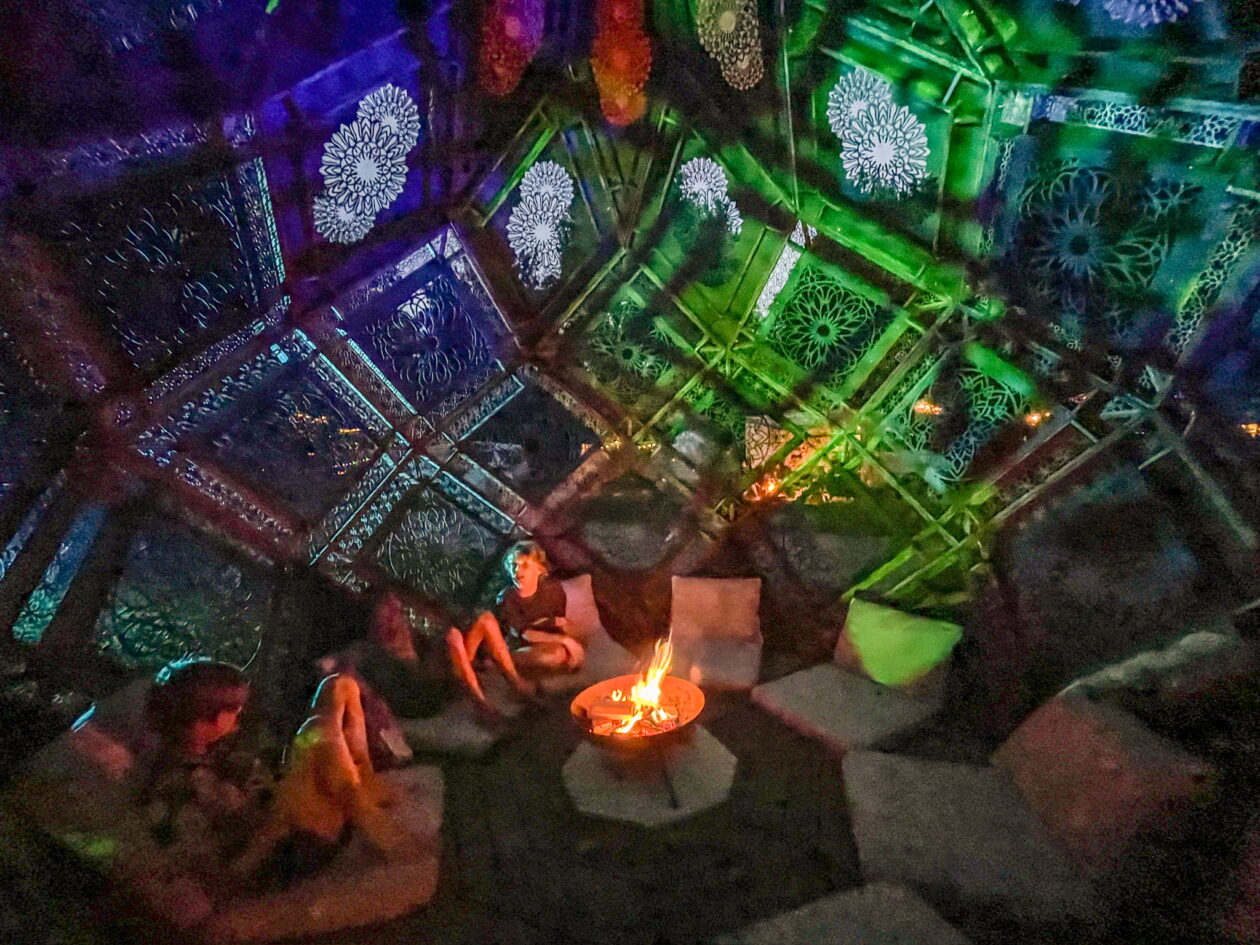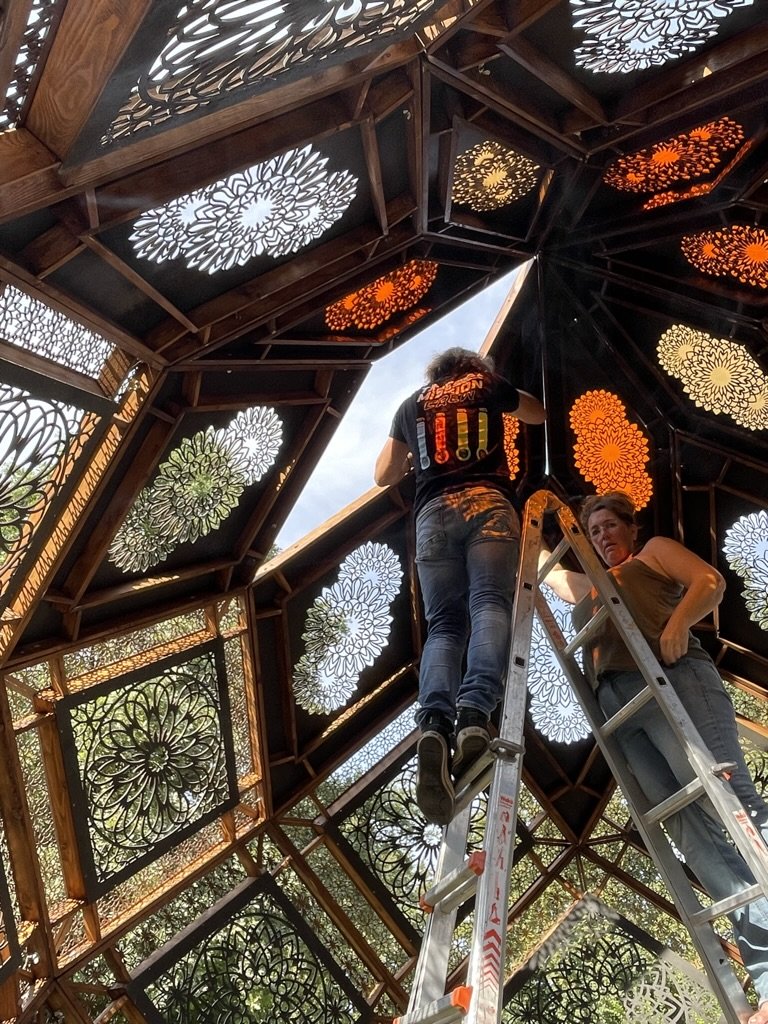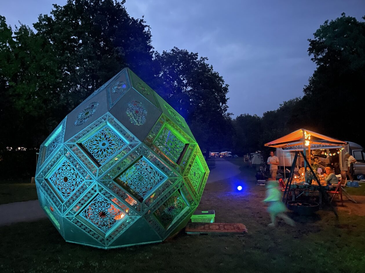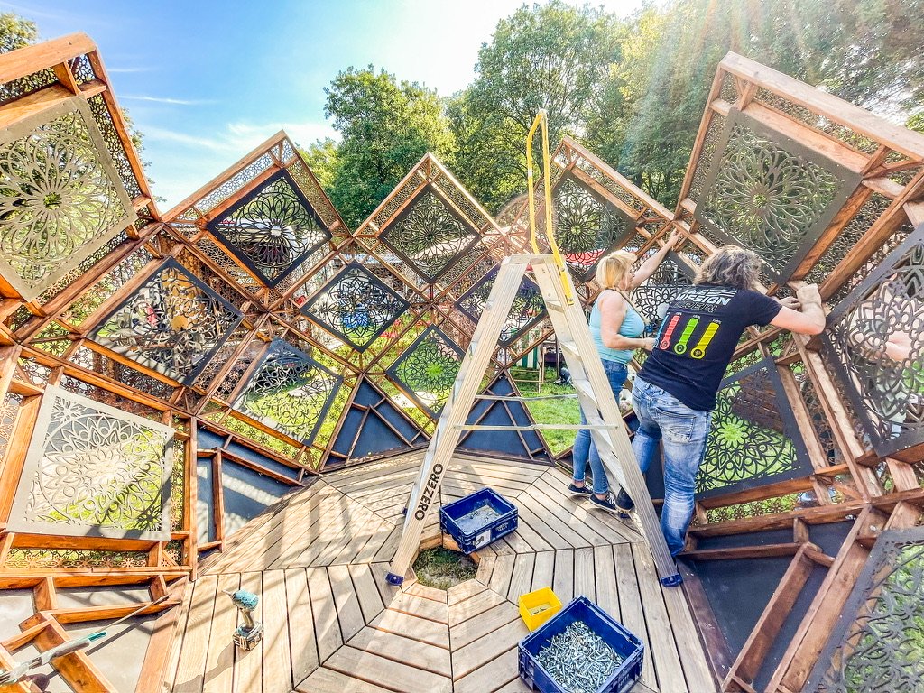 Niet zo heel heel lang geleden ( gister) in een land hier niet ver vandaan ( uurtje rijden ) woonden een nijver volkje ( Ronald , Nancy and friends) in een sprookjes bos ( camping de Lievelinge ) – van smorgens dauw tot s’avonds schemer dansten ze met hamer en kwast rond hout en verf en vielen dan pas in slaap als hun creativiteit was opgemorst – wij , de bezoekers zonder frees en oordeel en olympische luiaards loerden verrukt en horizontaal naar de vorderingen van het magische bouwsel wat verrees aan de overkant van het pad – waarlijk een heiligdom verduidelijkte een trage passant – chillroom ! riep een jeugdige nar – navelstaar yoga ui fluisterden de zweefkees – wat verdampte uren verder , bleek dat elke van de drie roetetoeters het elk op hun eigen wijze bij het rechte eind te hebben gehad – de verukkulukkke ui kent veel lagen –