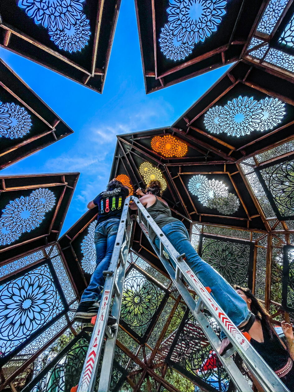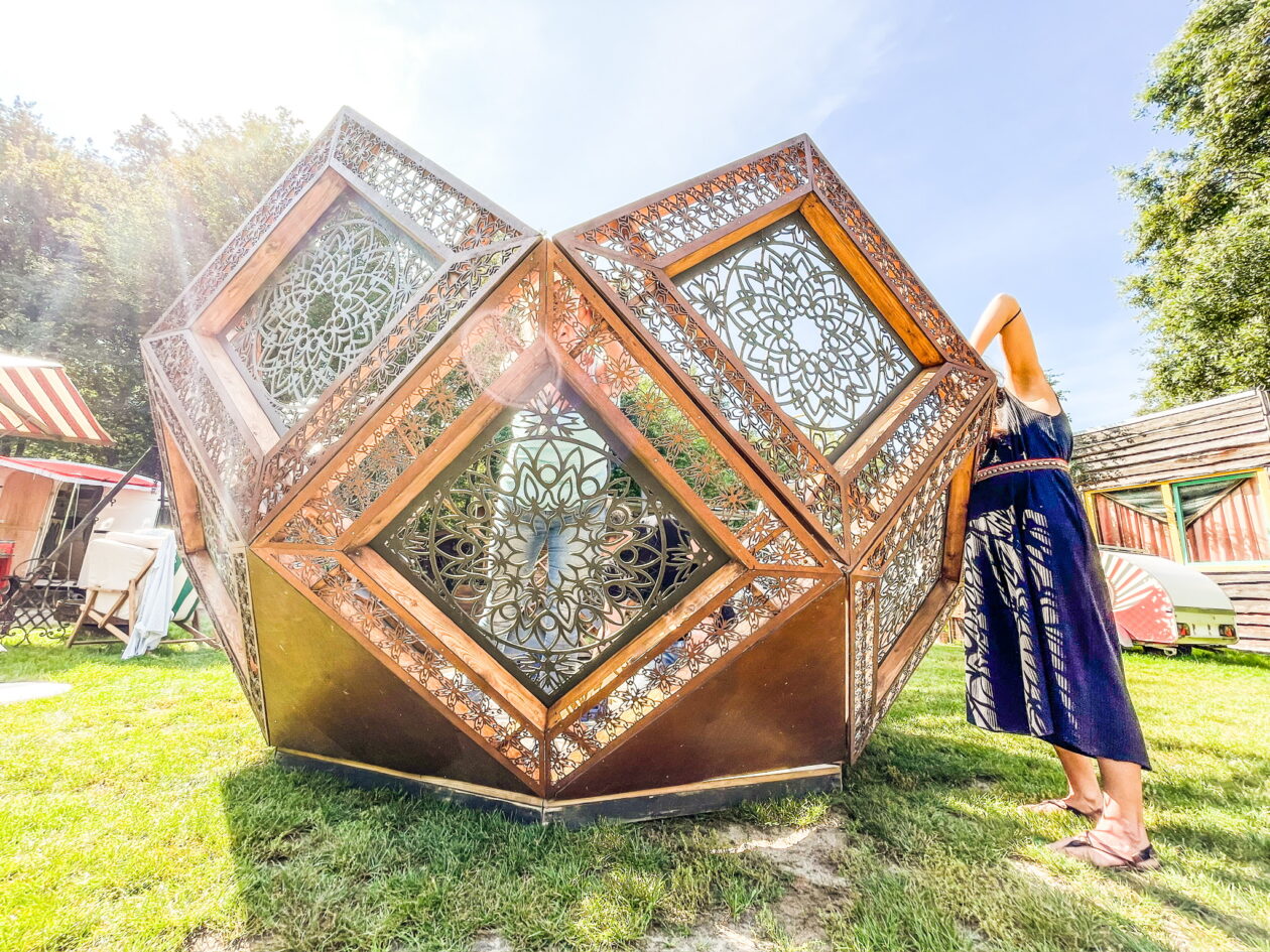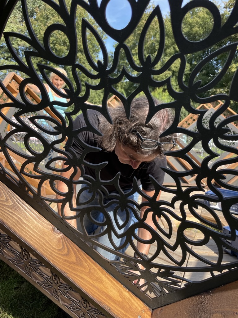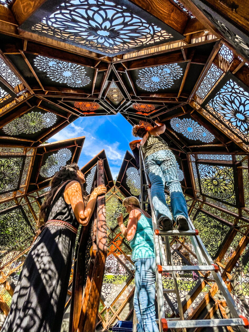 Niet zo heel heel lang geleden ( gister) in een land hier niet ver vandaan ( uurtje rijden ) woonden een nijver volkje ( Ronald , Nancy and friends) in een sprookjes bos ( camping de Lievelinge ) – van smorgens dauw tot s’avonds schemer dansten ze met hamer en kwast rond hout en verf en vielen dan pas in slaap als hun creativiteit was opgemorst – wij , de bezoekers zonder frees en oordeel en olympische luiaards loerden verrukt en horizontaal naar de vorderingen van het magische bouwsel wat verrees aan de overkant van het pad – waarlijk een heiligdom verduidelijkte een trage passant – chillroom ! riep een jeugdige nar – navelstaar yoga ui fluisterden de zweefkees – wat verdampte uren verder , bleek dat elke van de drie roetetoeters het elk op hun eigen wijze bij het rechte eind te hebben gehad – de verukkulukkke ui kent veel lagen –