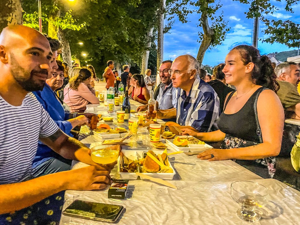 Zuid Frankrijk / Espalion – Franser word het niet – aan de oever van de Lot op het gravel waar het jaarlijkse wereldkampioenschap Pétanque word gehouden , draaien de varkens aan het spit en word er in de aligot op olympisch niveau geroeid – tout le village zit aan lange banken in de schaduw van de platanen –
