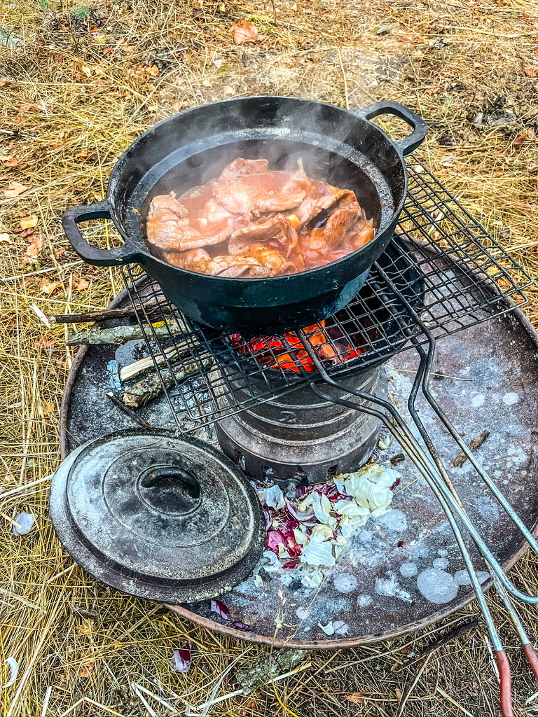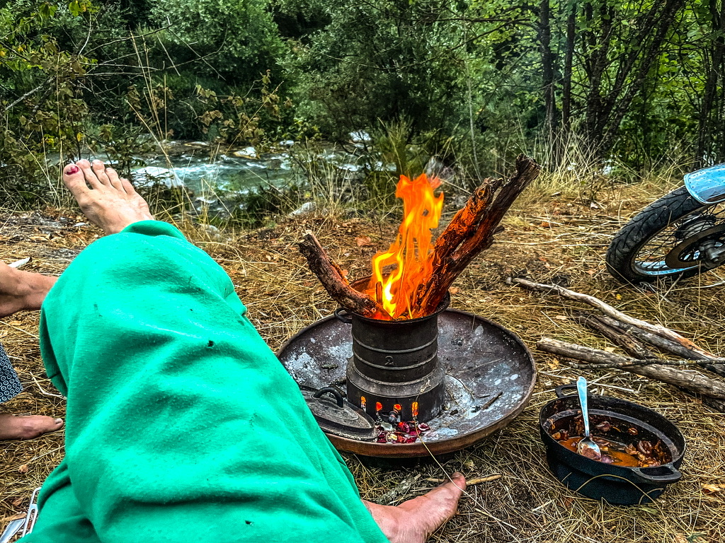Peet gaat avec plaisir kopje-onder, terwijl ik weer wat leven in mijn onderstel probeer te krijgen naast het kampvuur. Het leven is een groot verrukkelijk raadsel.