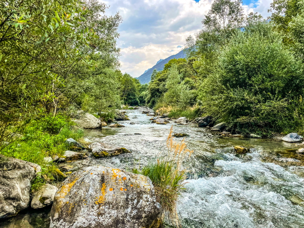 Met een tevreden buik vol polenta en het recept voor het plaatselijke after-dinner-drankje nog in mijn kop, stuurden we de bus bij Prazzo van de doorgaande weg af. We reden via een grindpad langs de rivier de Fiume Maira.