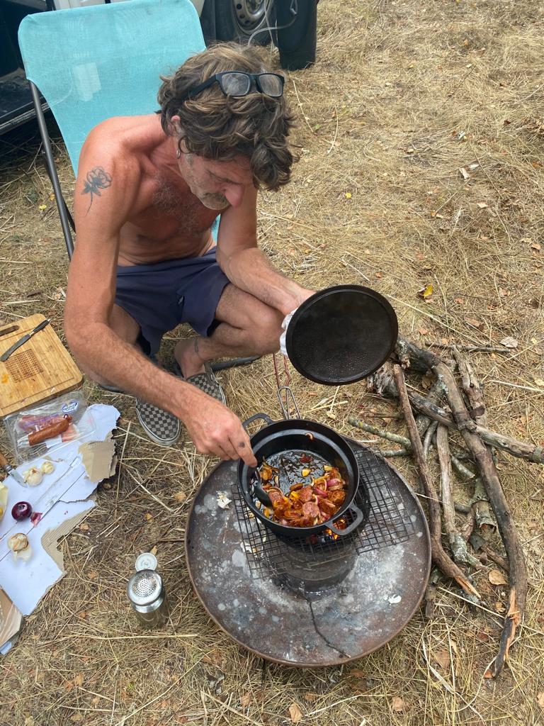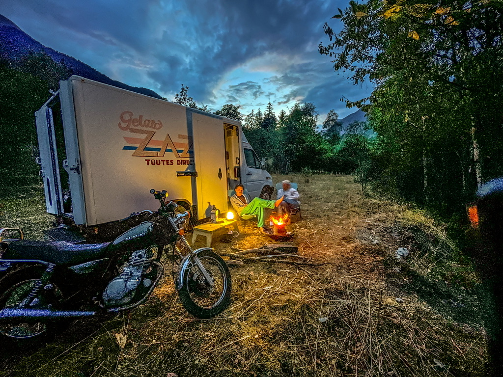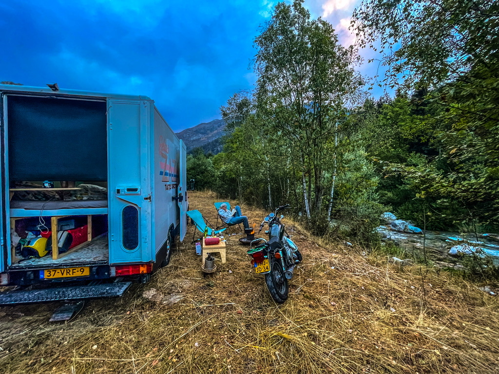 soms doe je er een uur over om een lekkere plek voor de nacht te vinden , nu 5 minuten – voor Cicades is het hier te koud , hier zijn koebellen en vogel getjilp het verhaal van de natuur – na een minuut met mijn voeten in de rivier zijn ze geen onderdeel meer van mijn lichaam – ik zie ze wel , maar ze zijn buiten gebruik – Peet gaat avec plaisir koppie onder als ik weer wat leven in mijn onderste gedeelte probeer te krijgen naast het kampvuur – het leven is een groot verukkulukkk raadsel –