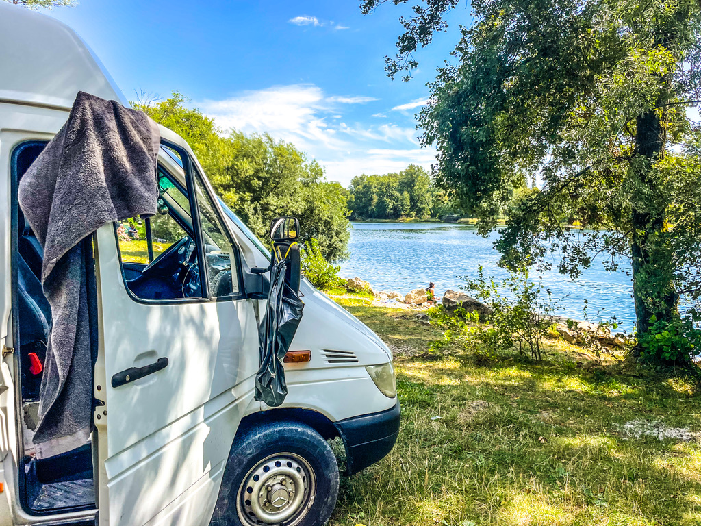Toffe plek gevonden aan de rand van het dorp en in de schaduw van de brug – Frankrijk op z’n best. Het valt niet te ontkennen, maar we zijn weer, avec tegenzin, op de terugweg. Het gekke is dat we nog vier à vijf dagen voor de boeg hebben, maar toch daalt er af en toe een soort grauwe sluier over je denkraam: naar huis! Een duik in de rivier, een slok wijn en wat ouwehoeren met de buren verjagen dat soort ongewenste gedachtes vlot, maar het blijft idioot dat zodra de neus van ons huis op wielen naar het noorden staat, er ruimte ontstaat voor dit soort muizenissen.