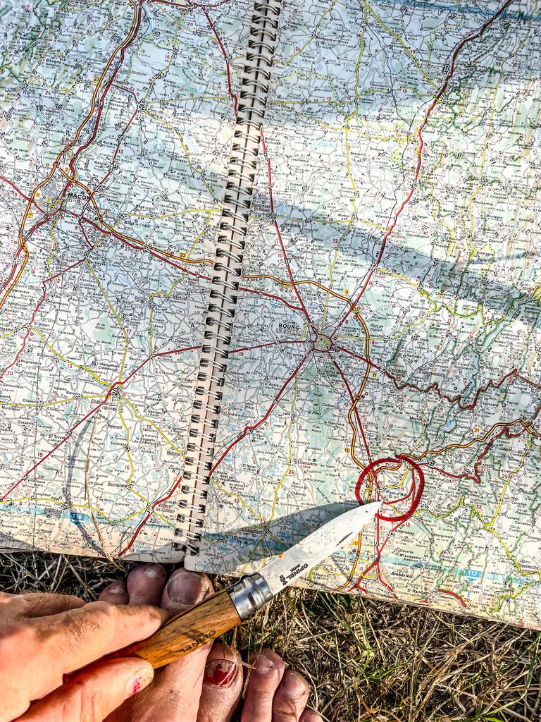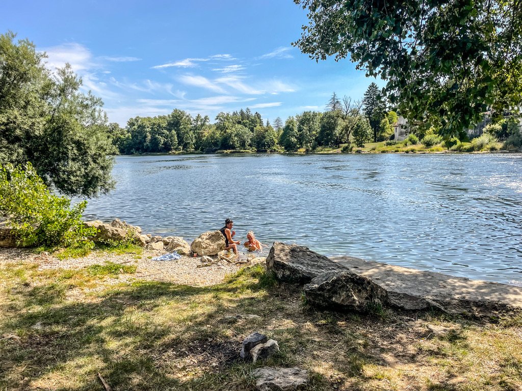 toffeplek gevonden aan de rand van het dorp en in de schaduw van de brug – Frankrijk op z’n best – het valt niet te ontkennen maar we zijn weer avec tegenzin op de terugweg – het gekke is dat we nog 4 a 5 dagen voor de boeg hebben maar toch daalt er af en toe een soort van grauwe sluier over je denkraam – naar huis ! – een duik in de rivier / slok wijn/ ouwehoeren met de buren verjaagt dat soort ongewenste gedachtes vlot – maar het blijft idioot dat als de neus van ons huis op wielen naar het noorden staat er ruimte ontstaat voor dit soort muizenissen –