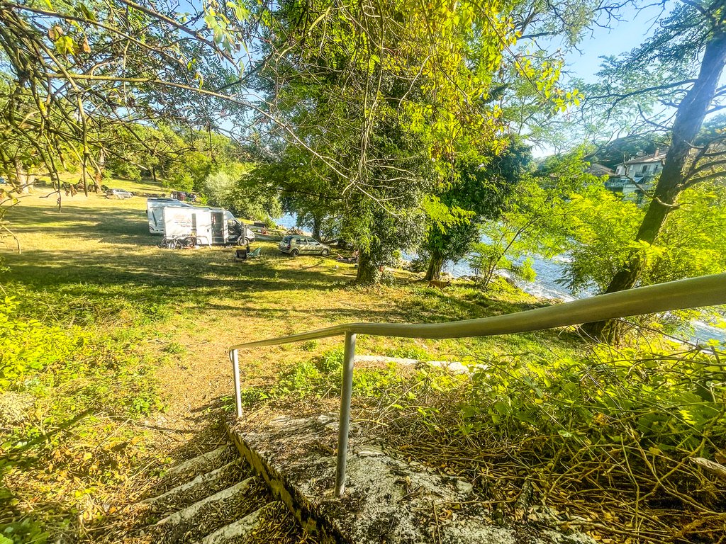 Wild kamperen in Italie / Piemont , direct aan een rivier omringd door berg en bos .