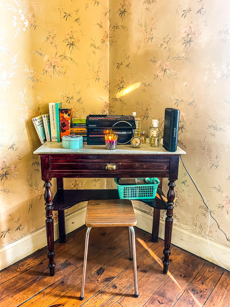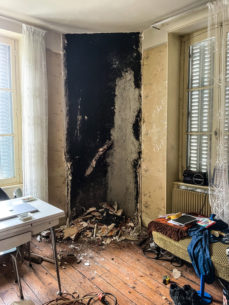 ’s / kapper / garage en een lekkere rivier om in te zwemen – het is niet ongebruikelijk dat je een Frans huis koopt met de inboedel – met een beetje mazzel is een gedeelte daarvan je smaak – onvermijdelijk is een gang naar de vuilstort en de Brocantes – je moet wennen aan zo’n vers huis – je voelt de oude bewoners nog – ze stommelen op de trap – trekken de plee door en slurpen hun soep op – als hun oude meubilair met een boog op de vuilstort verdwijnt – en er nieuwe voor terug komen – als er nieuw plezier en gelach door de muren geabsorbeerd wordt , dan verstommen hun voetstappen geleidelijk aan en trekken ze de deur voorgoed achter zich dicht –