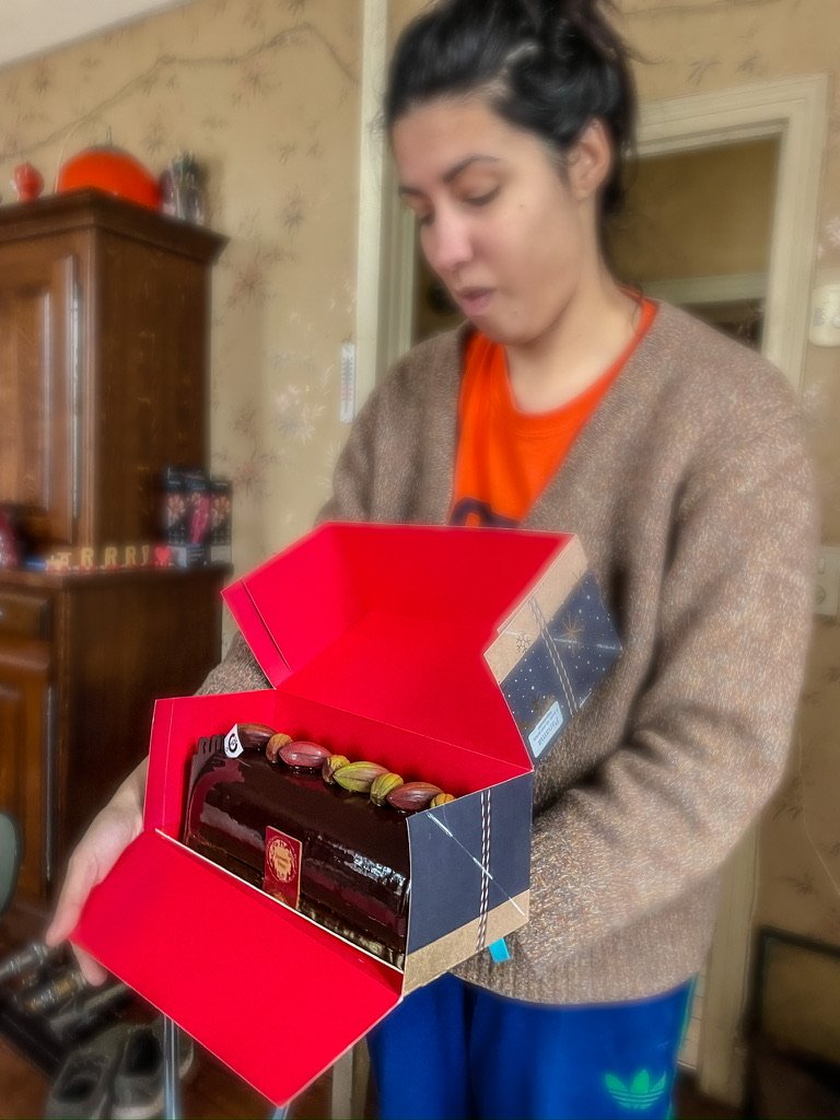 Galette des Rois word traditioneel op 6 januari “drie koningen” gegeten – maar een huis vol stuurloze atheïsten met trek kunnen zonder angst voor de torn van god deze enorme gevulde koek eten waaneer ze maar willen – afgezien van de datum volgden we de traditie op het scherp van de snede – de jongste van het gezelschap moet onder de tafel zittend aanwijzen in welke volgorden de punten taart worden verdeeld zodat elke vorm van fraude is uitgesloten – het zit namelijk zo dat in een van de taartpunten een porseleinen plaatje verborgen zit – degene die hem in zijn mond vind is de Rois en krijgt het papieren kroontje op zijn kop en mag een stille wens doen – gulzig weg happen is er dus niet bij – Owen is de gelukkige koning voor een dag – lang leve de koning ! Ik vind het tof