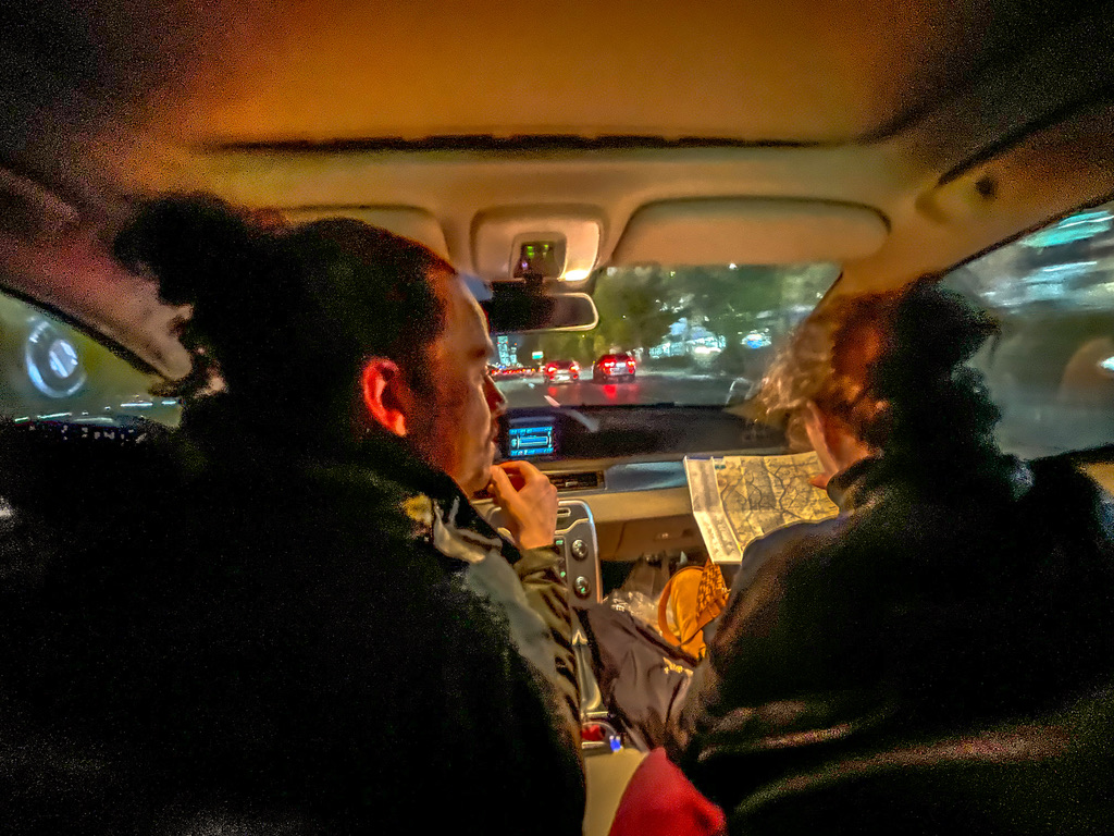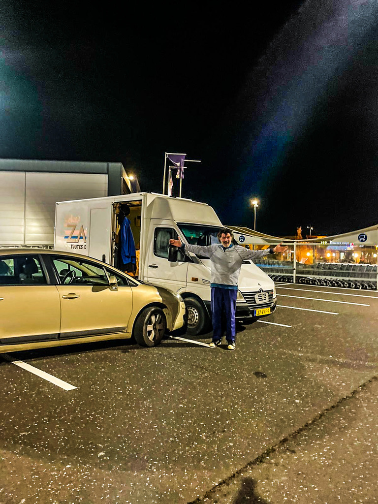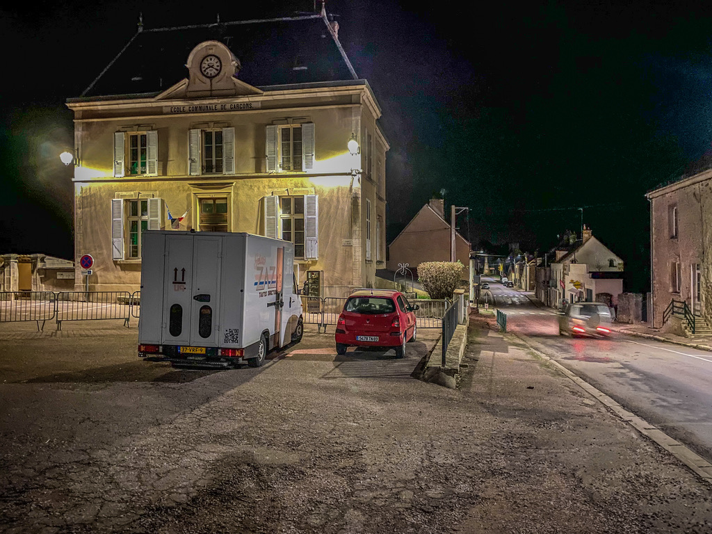 Al weer op de terugweg ook weer met de schemer die langzaam binnen sloop , was mijn lust in rijden op – boodschappen gehaald bij de supermarkt / besloten daar op het parkeerasfalt te overnachten – kachel aan – koplampen uit , buik vol – prima begin voor een mini avontuur – een haastige Française gewapend met een boodschappenlijst – parkeert haar auto zonder aan de handrem te denken op een iet wat aflopende parkeerplaats – zij spurt elegant de winkel in terwijl haar auto zich gezellig en zachtjes tegen de rode auto ervoor nestelt – iets later vertrekt het rode autootje en nu heeft de handrem loze auto vrijbaan en kan hij eindelijk wat vaart maken op het vrijwel lege en donkere parkeerterrein – je staat raar te kijken als je wordt aan gereden door een lege en afgesloten auto – wel een mooi sterk verhaal erbij .