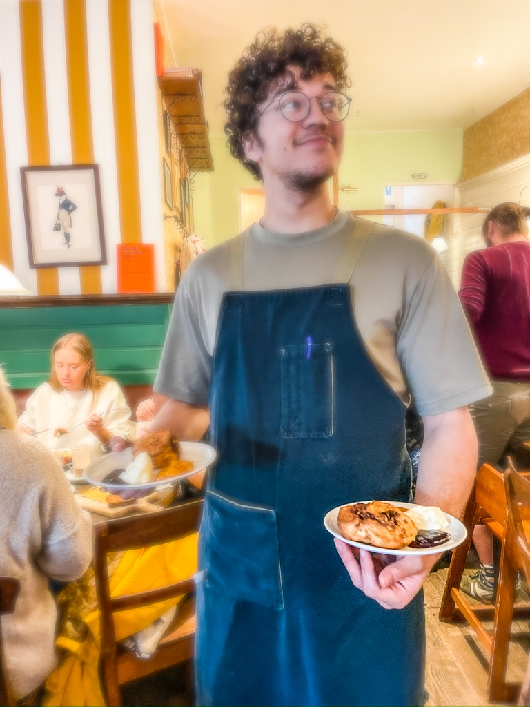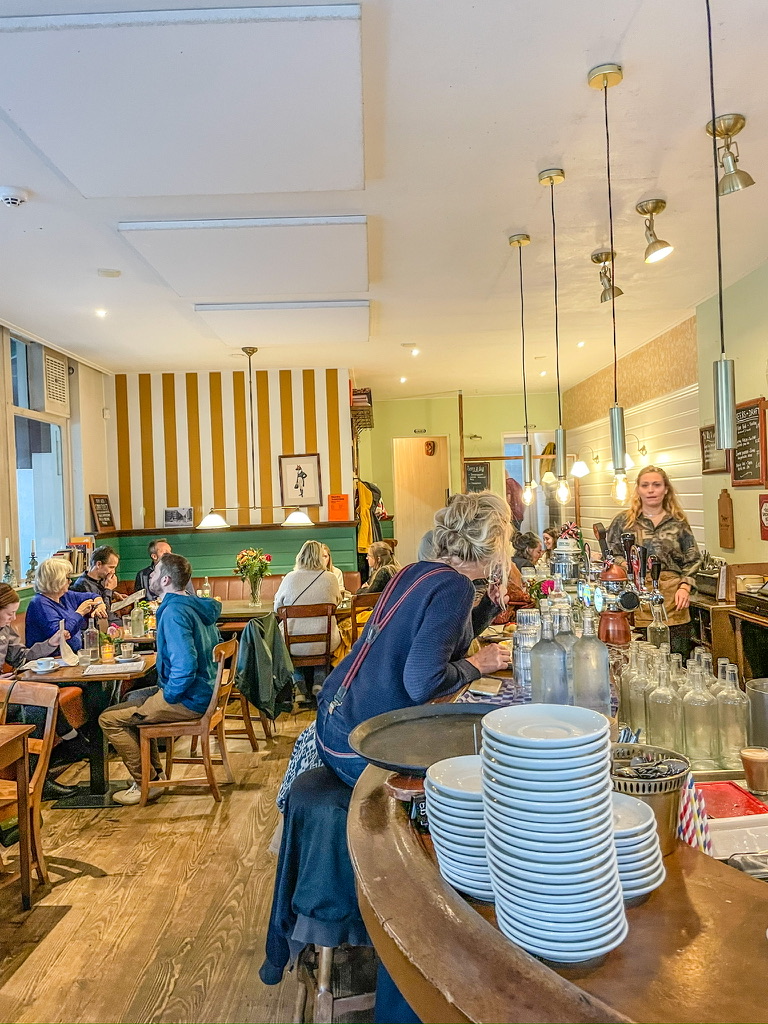 De koffiemachine sist en dampt en de klandizie is lekker internationaal. Zo’n scone, vers uit de oven, is toch magistraal voor neus en mond? Een kop koffie en een vers sappie erbij en het ochtendgeluk zoent je op de mond. Deze tent is ook een warm nest door de mensen die er werken; wij werden er vrolijk van. Met een buik vol Engels geluk verdwaalden we daarna in het Tropenmuseum en het Stedelijk.