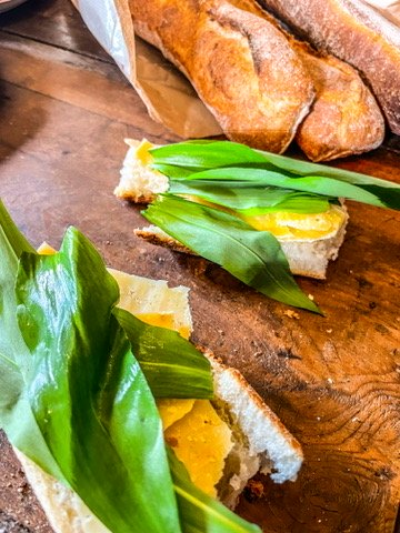 Vandaag gaan we eerst even daslook plukken voor de pasta pesto. De look is nog nat van de dauw en smaakt fantastisch op een stokbroodje met oude kaas. Ik moet uitkijken dat ik niet volkomen uit het spoor loop met lyrische verhalen over het Franse platteland op basis van een broodje zelfgeplukte look en vier dagen werk. Maar fijn is het wel. Na de pluk verloopt de terugweg traag, want bij elk huis dat te koop staat roep ik: โArrรชte!โ
